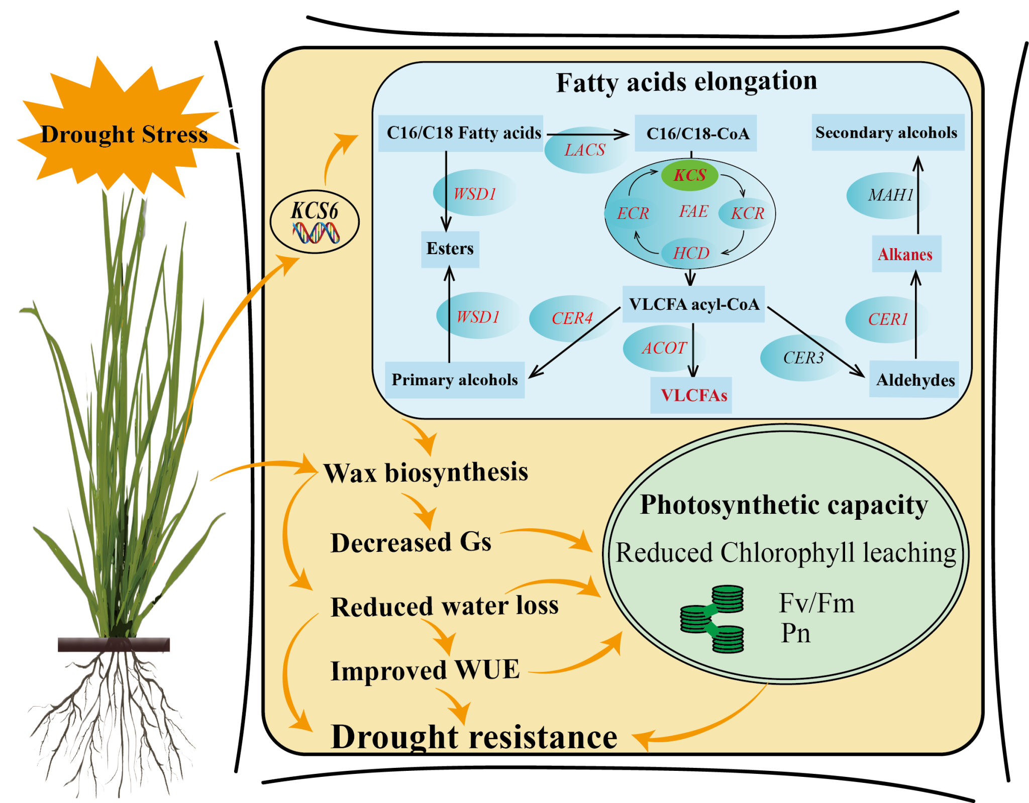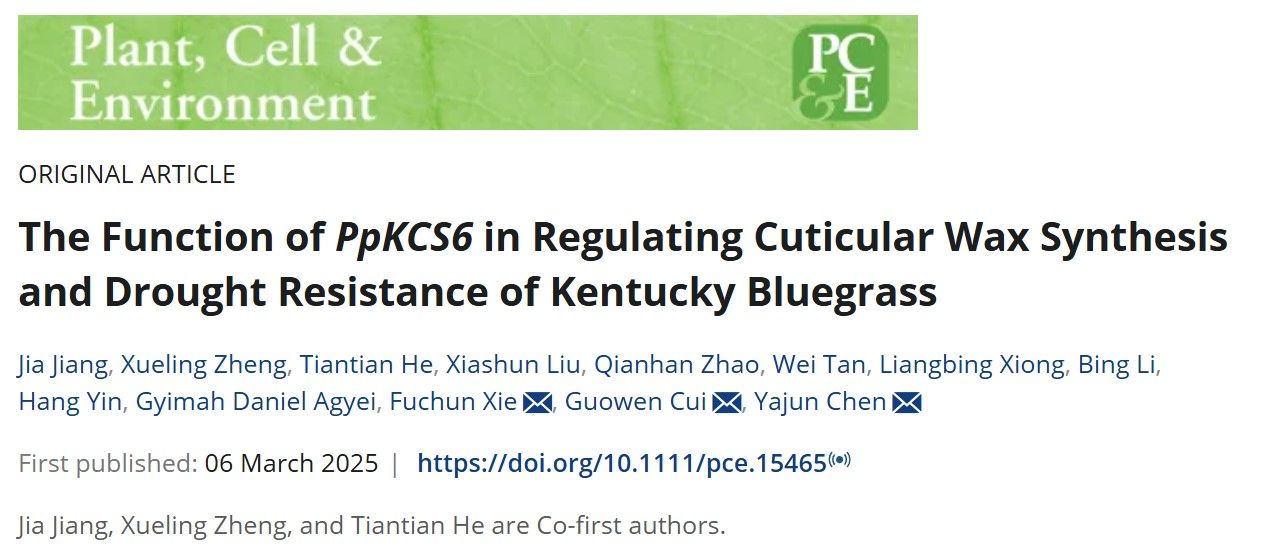 近日,我校动物科学技术学院草学学科在国际知名期刊《Plant, Cell & Environment》(五年IF=7.6,中科院1区Top期刊)在线发表题为“The Function of PpKCS6 in Regulating Cuticular Wax Synthesis and Drought Resistance of Kentucky Bluegrass”的研究论文。研究揭示了β-酮脂酰辅酶A合成酶基因PpKCS6通过调控草地早熟禾叶表蜡质形态和含量增强其抗旱性的分子机制。研究结果可为培育抗旱节水草坪草新品种提供基因资源和技术支撑。