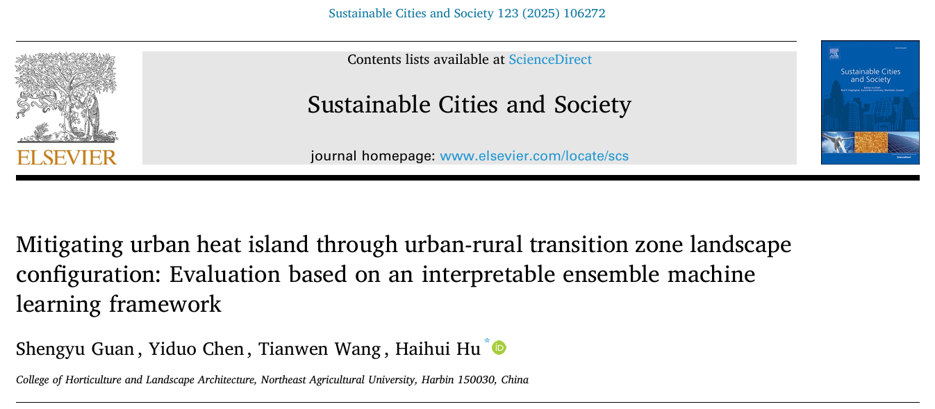 近日,我校园艺园林学院风景园林学科绿地景观与数字虚拟技术团队在工程技术国际顶级期刊《Sustainable Cities and Society》(中科院1区TOP,城市可持续发展领域顶级期刊,IF=10.5)上发表题为“Mitigating urban heat island through urban-rural transition zone landscape configuration: Evaluation based on an interpretable ensemble machine learning framework”的论文,这是我校风景园林师生首次在该期刊发表论文。