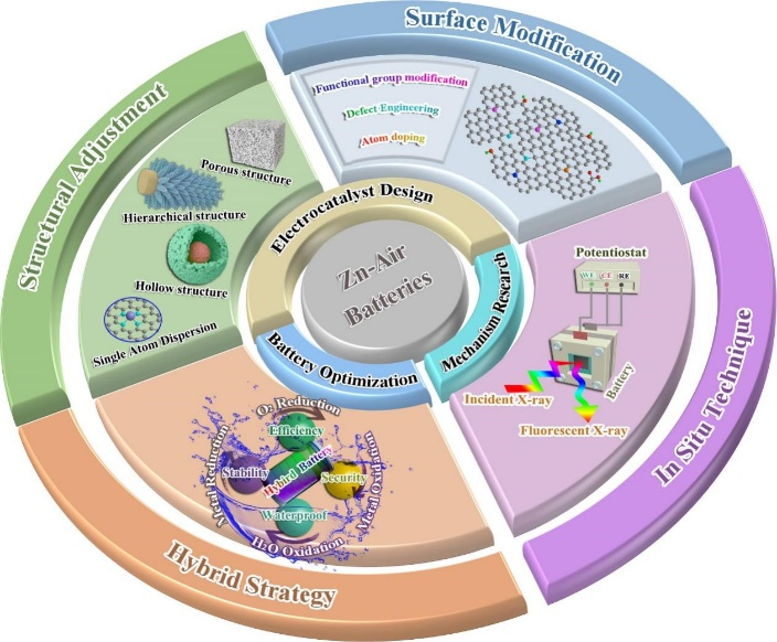 发表在《Energy Storage Materials》上的文章论述了锌-空气电池的研究现状,讨论了ORR和OER的反应机理。从表面改性和结构设计的角度总结了催化剂的调控策略,将理论计算与原位表征技术相结合介绍了氧电催化机制的最新进展。此外,综述还概述了提高电池能效的可行性策略,包括构建杂化锌-空气电池、引入有机物氧化反应以及光辅助策略等。强调了锌-空气电池未来的发展重心,旨在加速高性能锌-空气电池的商业化进程。