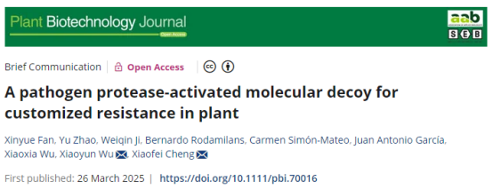 3月27日,我校植物保护学院程晓非教授团队在中科院1区top期刊《Plant Biotechnology Journal》(五年影响因子12.1)在线发表题为《A pathogen protease-activated molecular decoy for customized resistance in plant》的研究论文。本文利用植物内源激发肽可以触发免疫反应的特点,提出一种以病原物蛋白酶为诱饵,诱导激发肽激活,从而实现人工定制抗病性的新策略。