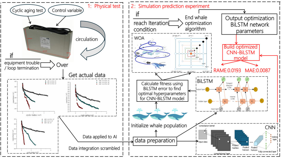 论文针对电力系统中低压并联电容器的剩余寿命预测问题,创新性提出了一种融合鲸鱼优化算法(WOA)、卷积神经网络(CNN)和双向长短期记忆网络(BiLSTM)的多模型预测框架,该方法充分融合空间结构识别与时序特征建模能力,并引入智能优化模块以实现全局调参能力。