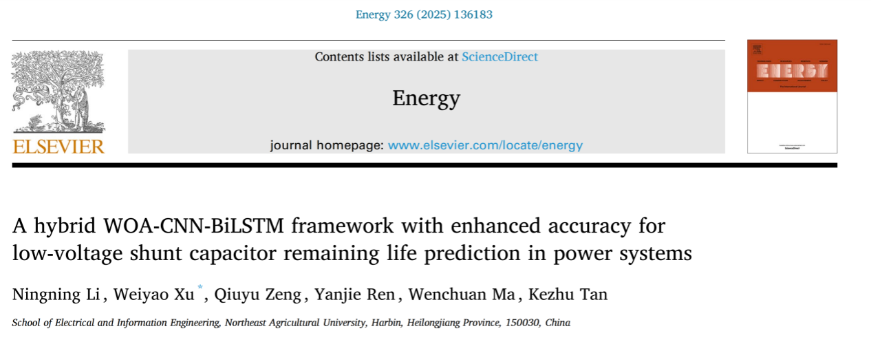 近日,电气与信息学院教师李宁宁在国际权威能源领域期刊《Energy》(IF=9.0,中科院一区TOP期刊)上发表题为“A Hybrid WOA-CNN-BiLSTM Framework with Enhanced Accuracy for Low-Voltage Shunt Capacitor Remaining Life Prediction in Power Systems”的研究论文,该论文围绕电力系统中低压并联电容器的剩余寿命预测问题,提出了一种融合鲸鱼优化算法(WOA)、卷积神经网络(CNN)与双向长短期记忆网络(BiLSTM)的深度学习预测框架。