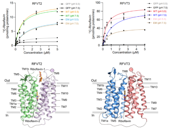 本研究首先深入分析了RFVT2和RFVT3的功能特性,发现二者对核黄素表现出相似的特异性,但对pH依赖性存在显著差异。为进一步探究导致RFVT2和RFVT3转运机制差异的原因,本研究创新性地使用GFP和纳米抗体作为标记,借助冷冻电镜成功解析了外向过渡状态的RFVT2、内向开放状态的RFVT3与核黄素复合物的高分辨率冷冻电镜结构,为阐明RFVT2和RFVT3的底物转运机制提供了结构基础。