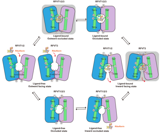 在蛋白结构解析基础上,通过结构分析和功能验证,明确了核黄素在转运蛋白中的结合位点及关键相互作用残基,发现了RFVT3中两个关键酸性残基D119和E145决定其pH依赖性活性的重要分子机制;通过分子动力学模拟,深入探讨了核黄素结合引起的构象变化以及其在不同状态下的结合自由能差异。基于以上研究结果,本研究提出了RFVT1-3转运核黄素的“rocker-switch”机制,完善了对其转运过程的理解。