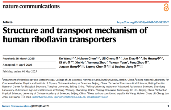 5月1日,我校生命科学学院姜巨全教授课题组、中国科学院物理研究所姜道华研究员课题组和清华大学药学院陈立功教授课题组等多家单位合作在国际著名学术期刊《自然•通讯》(Nature Communications,IF 14.7)上合作发表题为“Structure and transport mechanism of human riboflavin transporters”的研究论文。我校生命科学学院博士研究生王柯、博士毕业生陈慧文(现攻读中国科学院物理研究所博士后)、原清华大学药学院陈立功课题组博士后程丽丽、北京大学赵珺、北京望石智慧科技有限公司黄博为本论文的共同第一作者,姜巨全教授、姜道华研究员、陈立功教授为共同通讯作者,我校为第一署名单位。