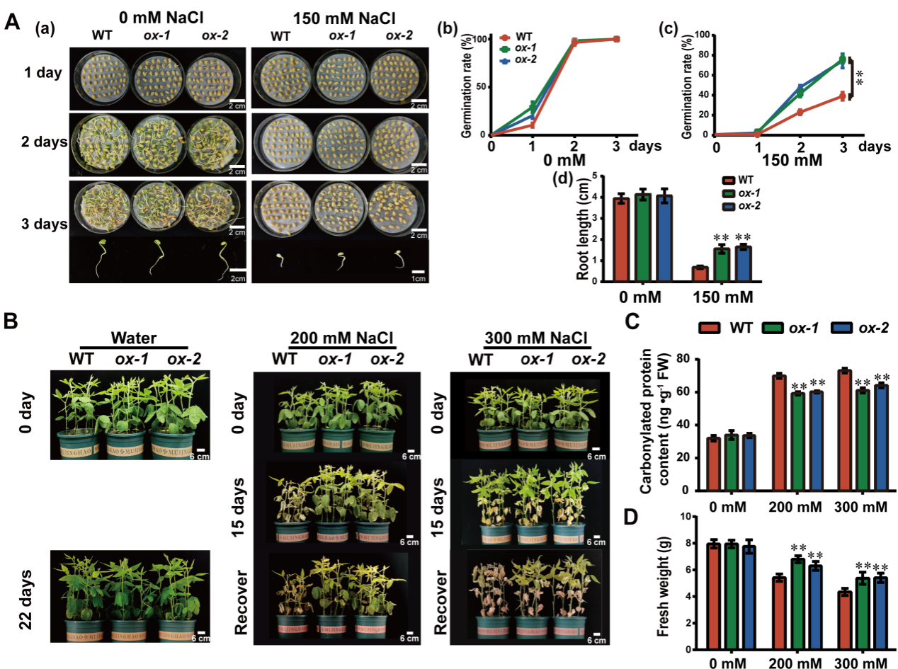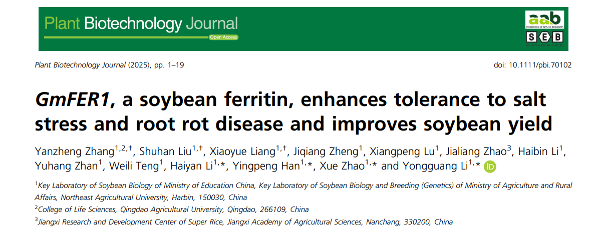 近日,我校农学院韩英鹏、李永光、赵雪团队在国际知名植物学期刊Plant Biotechnology Journal(中科院一区TOP,IF=11.2)上发表了题为”GmFER1, a soybean ferritin, enhances tolerance to salt stress and root rot disease and improves soybean yield”的研究论文,首次系统揭示了大豆铁蛋白基因GmFER1的多重生物学功能。研究发现,该基因不仅能够显著增强大豆对盐胁迫和根腐病的抗性,同时还能提高大豆产量和改善品质性状,这一突破性发现为大豆抗逆分子育种提供了新的基因资源和理论依据。