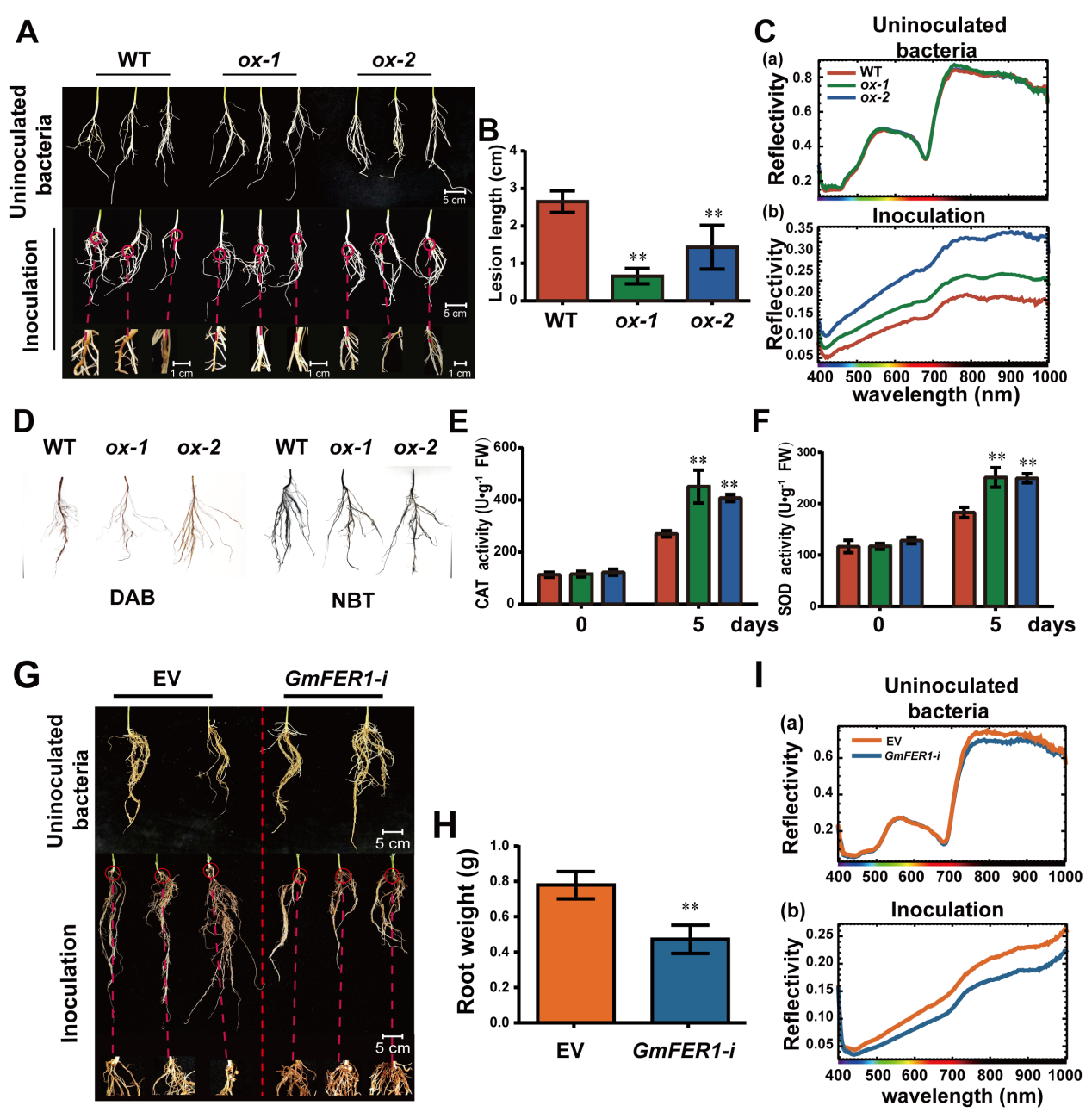 GmFER1通过铁依赖的活性氧清除机制增强大豆镰刀菌抗性。在铁充足条件下,GmFER1-ox植株接种病原菌后病斑长度减少62%,而铁缺乏时抗性消失。分子机制分析表明,GmFER1-ox植株H2O2含量降低,CAT/SOD活性分别提高2.3/1.9倍;相反,GmFER1-i株系病症加重,根系生物量减少37%。这些结果共同证实GmFER1通过增强ROS清除能力提高大豆对镰刀菌的抗性。