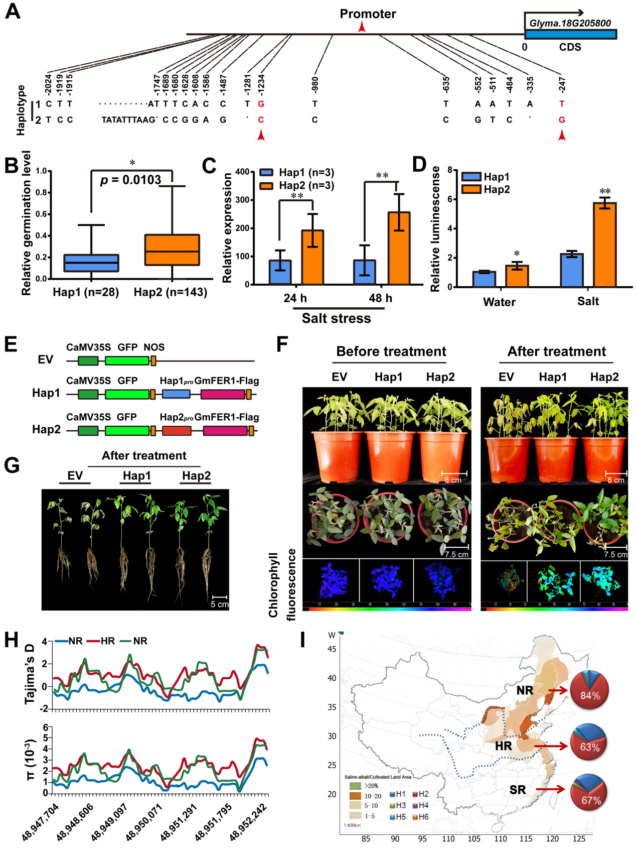 GmFER1的自然变异(特别是Hap2单倍型)具有重要的农业应用价值。GmFER1的自然变异通过增强启动子活性显著提高大豆的耐盐性和抗病性,同时增加豆荚数、百粒重和单株产量,并提升油脂及异黄酮含量。该变异在中国东北盐碱地区表现突出,可作为分子标记用于耐盐抗病高产品种的精准选育,并为其他作物的抗逆改良提供参考。这种"一因多效"的优异等位基因不仅为大豆遗传改良提供了新资源,减少化学农药使用,提高中低产田(特别是盐碱地)生产力20-25%。该研究成果为作物抗逆高产育种提供了新的理论依据和技术途径。