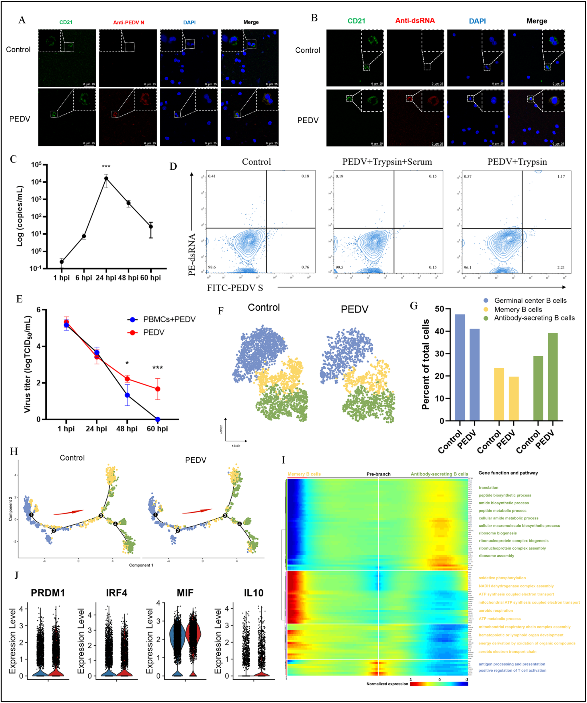 研究团队在深入分析中发现,PEDV不仅感染肠上皮细胞,还表现出对肠上皮前体细胞、干细胞、TA细胞以及多种免疫细胞的广泛感染能力。特别值得关注的是,PEDV虽然能在T淋巴细胞和B淋巴细胞中启动复制过程,但却无法产生具有感染性的子代病毒。令人警惕的是,PEDV感染可诱导T细胞凋亡,这将直接削弱宿主的免疫防御能力。这一发现为解析临床上PEDV感染后未能被免疫系统有效“歼灭”、最终导致仔猪高死亡率的现象提供了分子层面的证据。