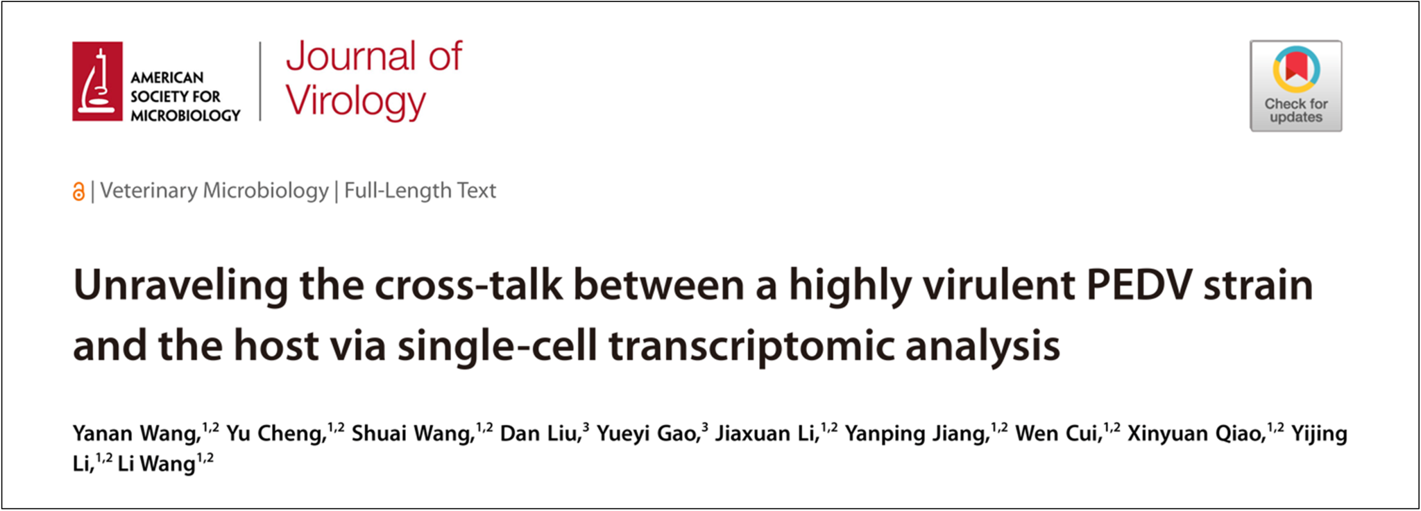 近日,学校动物医学学院兽医病原学团队在国际病毒学权威期刊《病毒学杂志》(Journal of Virology)发表了题为《通过单细胞转录组分析揭示高致病性PEDV毒株与宿主的互作关系》(Unraveling the cross-talk between a highly virulent PEDV strain and the host via single-cell transcriptomic analysis)的研究论文。该研究突破了传统群体水平研究的局限性,从单细胞维度精细描绘了病毒-宿主互作过程中的细胞命运变化、信号通路重塑及免疫调控现象。研究成果不仅为深入阐明PEDV致病机制提供了单细胞层面的全新视角,也为开发靶向病毒-宿主互作网络的新型干预策略奠定了重要理论基础。