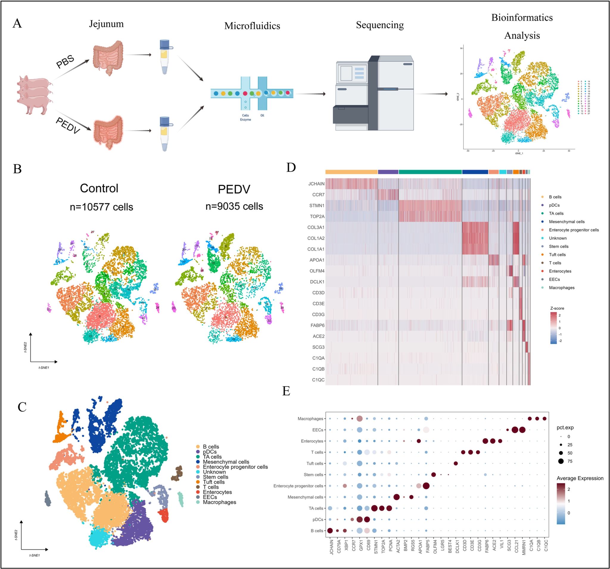 该研究团队从哈尔滨周边暴发严重腹泻疫情的猪场采集临床样本,经过严格的体外分离培养和动物回归试验,成功获得一株具有典型致病特征的PEDV流行毒株。利用单细胞转录组测序平台,对19,612个感染仔猪和健康仔猪的空肠细胞进行了测序分析,绘制了PEDV感染过程中肠道组织的单细胞动态响应图谱,发现该病毒的感染展现出“双刃剑”效应:一方面通过刺激肠道干细胞和TA细胞的增殖分化,加速上皮组织再生;另一方面则破坏细胞间正常的通讯网络,干扰包括干扰素通路在内的多条关键免疫信号通路的传导。该发现生动诠释了病毒与宿主之间精妙的攻防博弈关系,为深入理解冠状病毒致病机制提供了全新视角。