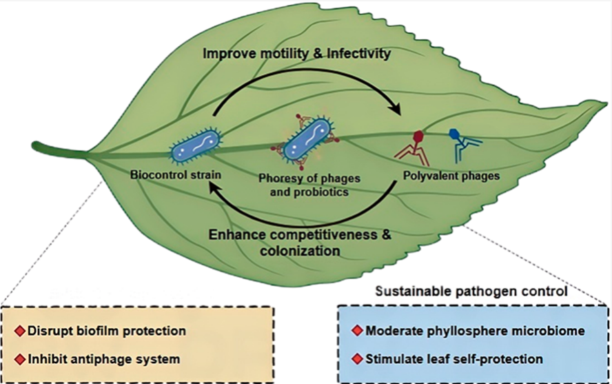 本工作聚焦噬菌体疗法技术的局限性,构建了噬菌体“搭便车”于非宿主载体生防细菌(生防菌枯草芽孢杆菌Bacillus subtilis,BS)的携播体系,探究了该体系靶向消减大豆细菌性叶斑病病原菌的协同增效效能与机制,进一步探究了如何在农业环境中增强噬菌体疗法,以克服生物膜保护和噬菌体抗性带来的限制。结果表明,该体系存在显著的协同效应,即噬菌体能够使得载体细菌定殖能力提升1.2倍,而载体细菌促进提高噬菌体感染效率约1.4倍。在大豆叶际中,该体系处理下的病原生物膜总生物量比未处理组降低58%,病原菌数量减少82%。宏转录组分析显示,携播体系显著增强了载体细菌的运动性与能量代谢,同时抑制了病原菌的防御系统及能量代谢。同时多组学联合分析揭示了,噬菌体-益生菌携播体系可形成有利于消减大豆叶际病原菌的高稳定性与高迁移性的携播共生体,并激发叶际微生物的防御功能,防治豆秸越冬病害。综上,噬菌体通过“搭便车”载体生防菌的携播策略,为叶际微生物组调控和细菌性病害防治提供了一种新颖高效的方法。
