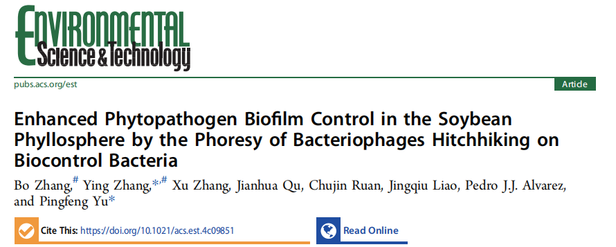 近日,我校张颖教授团队张博副教授在国际著名学术期刊《EnvironmentalScience & Technology》上发表了题为“Enhanced Phytopathogen Bioflm Control in the Soybean Phyllosphere by the Phoresy of Bacteriophages Hitchhiking on Biocontrol Bacteria”的研究论文(DOI:10.1021/acs.est.4c09851),研究成果入选该期刊内封面文章。