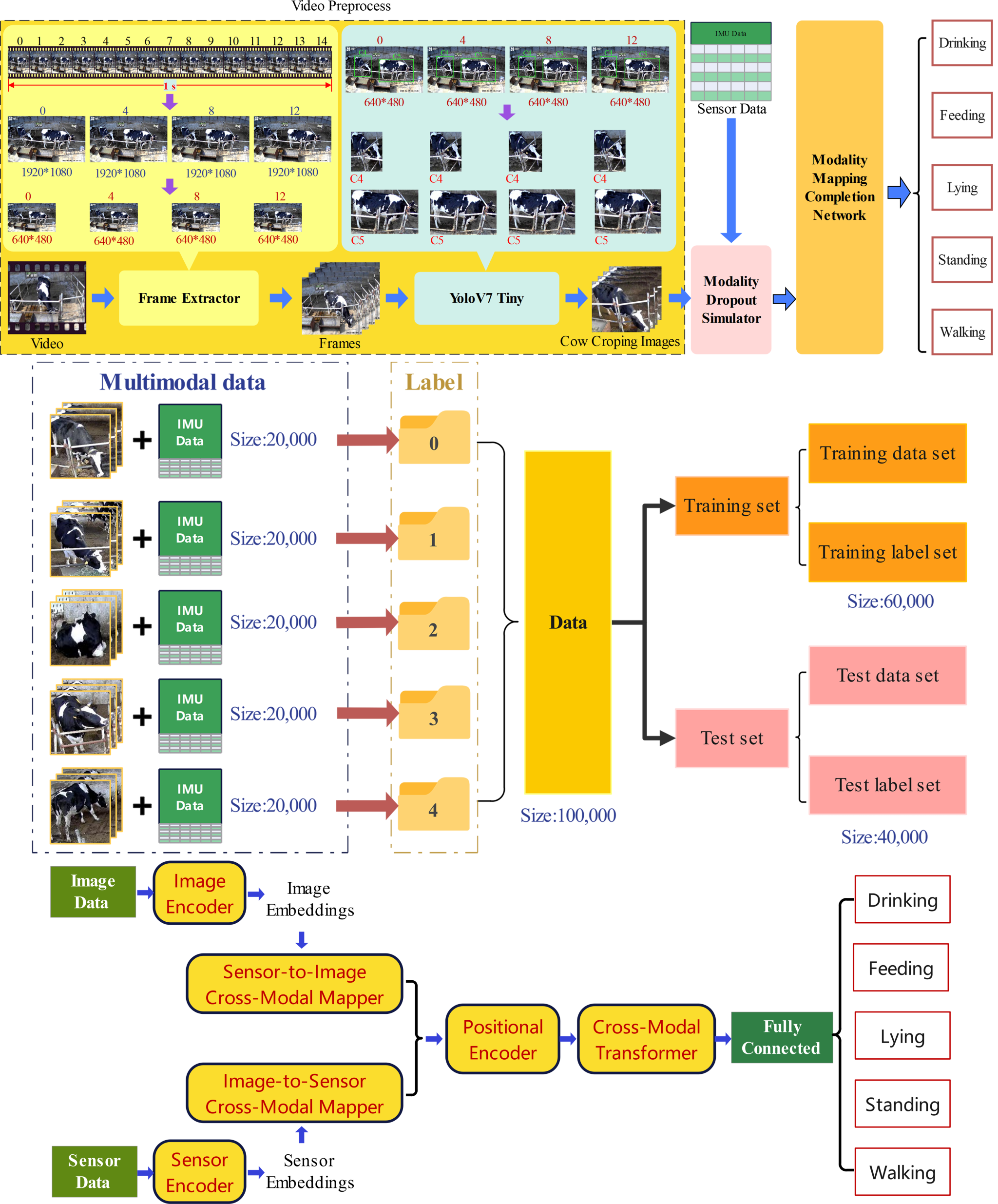 在奶牛养殖中,准确识别奶牛的行为对于提升健康管理、繁殖效率、生产性能以及动物福利至关重要。该研究旨在解决多模态奶牛行为识别算法中的模态丢失问题,这种情况可能是由于农场环境中传感器或视频信号干扰、恶劣环境条件、极端天气、网络波动等因素引起的,该研究提出了一种模态映射完成网络方法,将不完整的传感器和视频数据映射到一起,以改善在模态丢失条件下奶牛行为的多模态识别。