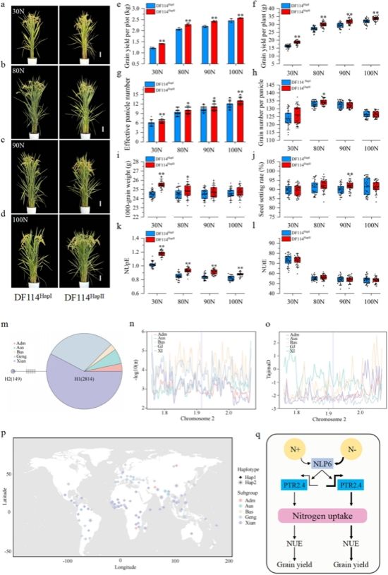 这项研究通过对255份水稻种质资源进行全基因组关联分析(GWAS),在2号染色体上鉴定到一个与氮素利用效率(NUE)显著相关的关键位点qNUE1,并确定转录因子基因OsNLP6是该位点的核心功能基因。研究发现,OsNLP6编码一个NIN-like蛋白家族转录因子,其表达具有根系特异性,且受低氮胁迫显著诱导。与野生型(WT)相比,OsNLP6过表达植株在低氮和高氮条件下均表现出显著增加的有效穗数和单株产量等,15N示踪实验证实OsNLP6增强硝酸盐(NO3-)的吸收与转运,并提高孕穗期叶片氮含量和氮吸收效率。说明OsNLP6作为硝酸盐响应转录因子,在促进水稻氮吸收方面发挥核心正调控作用。进一步研究表明,OsNLP6能够直接结合硝酸盐转运基因OsPTR2.4启动子区的硝酸盐响应元件,激活其表达。OsPTR2.4的功能验证表明OsNLP6与OsPTR2.4在同一遗传通路上调控水稻氮素吸收利用率。研究还发现了一个优异单倍型OsNLP6HapII,该单倍型在东南亚籼稻亚群中显著富集,携带该单倍型的品种表现出更高的氮素利用效率。群体遗传学分析表明,OsNLP6在水稻驯化过程中经历了强烈的正向选择,这为分子设计育种提供了重要靶点。综上所述,转录因子OsNLP6调控氮转运蛋白OsPTR2.4参与水稻氮素的吸收和转运过程,赋予水稻高氮素利用效率特性。