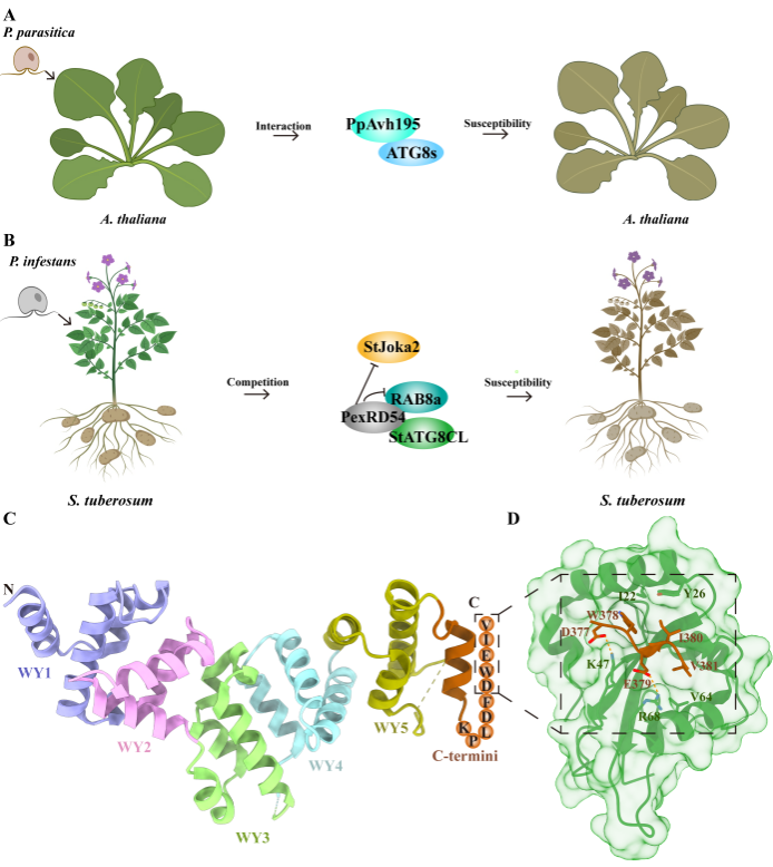 近日,园艺园林学院王傲雪团队在植物病理学权威期刊《Molecular Plant Pathology》发表了题为Structural Insights Into the Role of RxLR Effectors in the Arms Race Between Oomycetes and Plants的综述。该综述围绕卵菌与植物间的“军备竞赛”,系统总结了卵菌RxLR效应蛋白在调控寄主细胞自噬、RNA转录、酶催化活性以及免疫反应过程中的结构机制,为针对RxLR效应蛋白作用机制开发绿色、可持续性的卵菌病害防控手段及培育抗病作物品种提供重要依据。