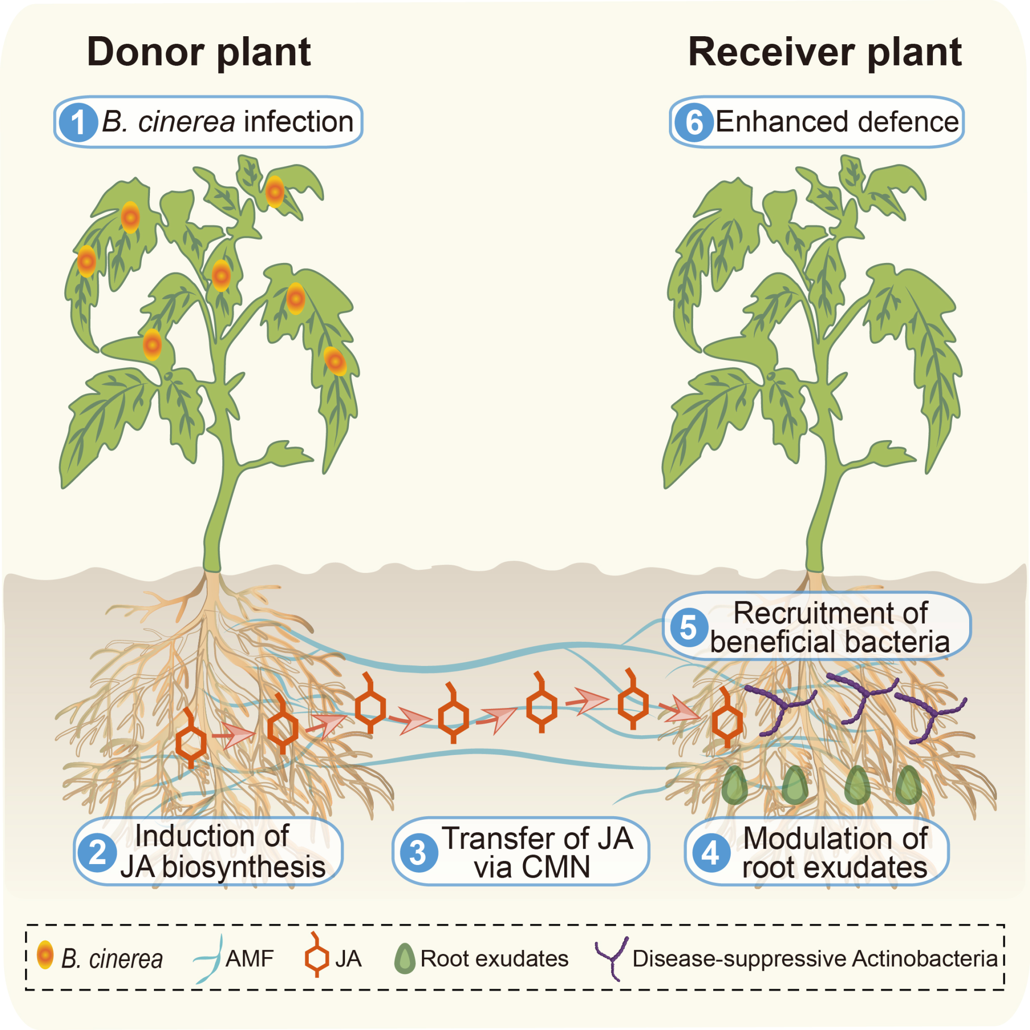 丛枝菌根真菌能够将不同植物根系相连接形成菌根网络,并能够作为植物间信息交流的渠道。菌根网络可以将被病原体侵染植物(供体植物)产生的抗性信号传递给邻近的健康植物(受体植物),从而诱导受体植物产生防御反应。然而,菌根网络介导的植物间互作机制还不清楚。该研究首次揭示了菌根网络介导的植物间互作能够增强根际微生物组抑病力。研究发现,供体番茄植株被灰霉病菌侵染后,菌根网络能将供体植物产生的信号物质茉莉酸传送给健康的受体植株。随后,受体植株会改变自身根系分泌物,从而招募特定的有益微生物,从而构建起一道根际防线、增强对病害的抵抗力。该研究有助于更好地理解菌根网络介导的植物间互作如何影响根际微生物组装配,也为开发基于植物微生物组的生态防控策略、推动农业可持续发展提供了科学依据和应用前景。