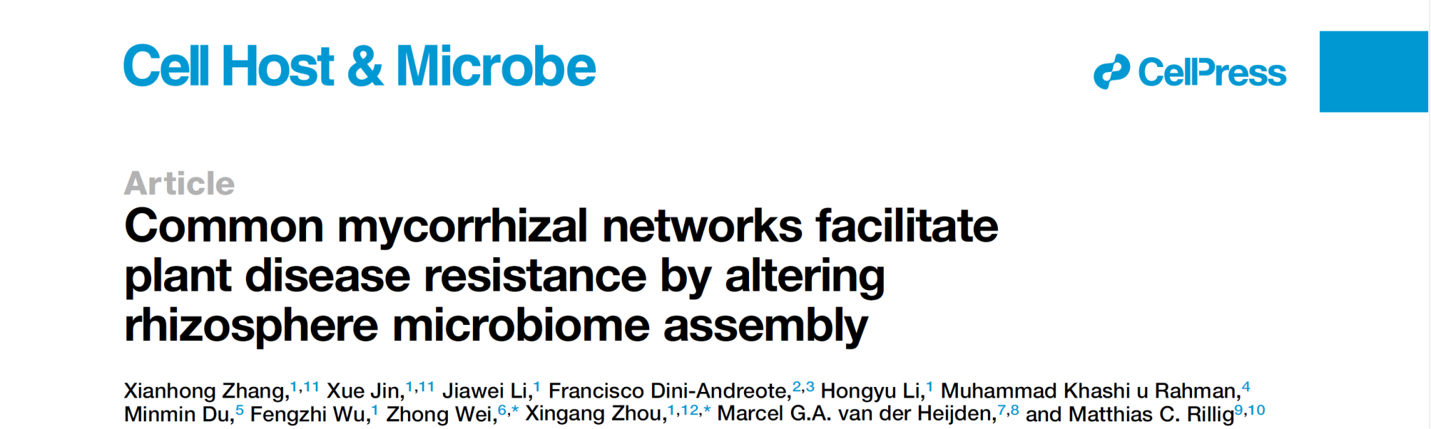 近日,我校园艺园林学院周新刚研究员等与多家单位合作,在解析菌根网络介导的植物间互作机理方面取得突破性进展,研究成果以《Common mycorrhizal networks facilitate plant disease resistance by altering rhizosphere microbiome assembly》为题发表于Cell核心子刊《Cell Host & Microbe》(中科院1区,IF = 18.7),研究揭示了菌根网络介导的植物间互作通过调控根际微生物组构建而提高植物抗病性。该研究登上了Cell Press官网头条。