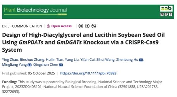 近日,《Plant Biotechnology Journal》杂志在线发表了由我校陈庆山教授团队撰写的论文“Design of High-Diacylglycerol and Lecithin Soybean Seed Oil UsingGmPDATsandGmDGATsKnockout via a CRISPR-Cas9 System”。该研究通过CRISPR/Cas9基因编辑技术敲除大豆中GmDGAT1A/B/C与GmPDAT1B/D/2A/2B基因,实现种子脂质合成途径重定向,成功创制出富含二酰甘油(DAG)和卵磷脂的大豆新种质。该成果为功能性食用油开发、大豆营养品质改良提供了有效策略与种质基础。