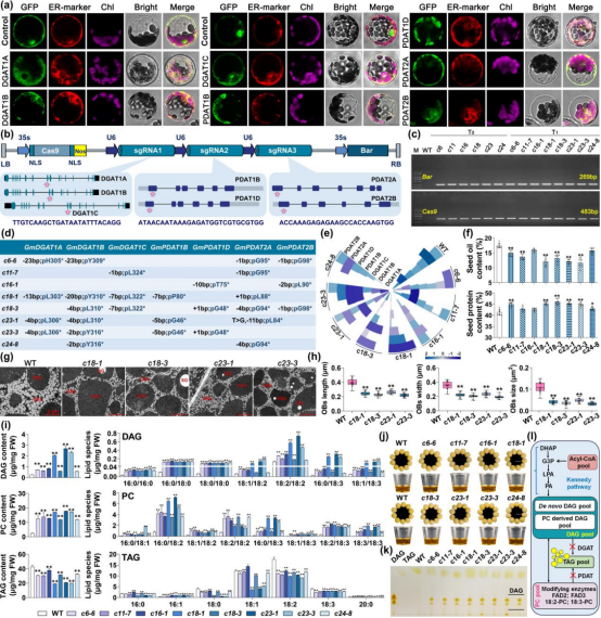 植物中TAG主要经Kennedy通路由DGAT(二酰甘油酰基转移酶)催化生成,亦可由PDAT(磷脂:二酰甘油酰基转移酶)以PC为酰基供体合成,这两种酶共同调控DAG—PC—TAG的碳流平衡。本研究采用CRISPR-Cas9技术在大豆中精准敲除GmDGATs家族与GmPDATs家族关键成员,阻断TAG合成的两条主要通路,协同提升“高二酰甘油(高DAG)”与“高卵磷脂”两项优质性状,创制可直接应用的大豆新种质,并提出高效的油脂品质改良基因编辑策略。
