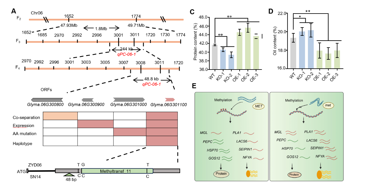 大豆是全球最重要的经济作物之一,同时也是人类食用和动物饲料的重要蛋白质来源,其种子蛋白含量一直是育种工作的重点关注对象(Li et al., 2024)。DNA甲基化作为最早被发现的表观遗传学机制,其在植物的研究大多聚焦于抗病或抗逆中(Zhang et al., 2018)。然而,甲基化对大豆蛋白含量的影响却很少受到关注,甲基转移酶基因如何调控大豆蛋白含量的机制并不清楚。近日,我校陈庆山教授团队/齐照明研究员课题在期刊Journal of Integrative Plant Biology(中国科学院一区,IF = 9.3)上发表了题为《Natural variation inGmMET, an S-adenosyl-L-methionine-dependent methyltransferase gene, influences seed protein content in soybean》的研究论文。该研究精细定位了大豆6号染色体上蛋白质含量QTL(qPC06-1),并解析候选基因GmMET的功能。