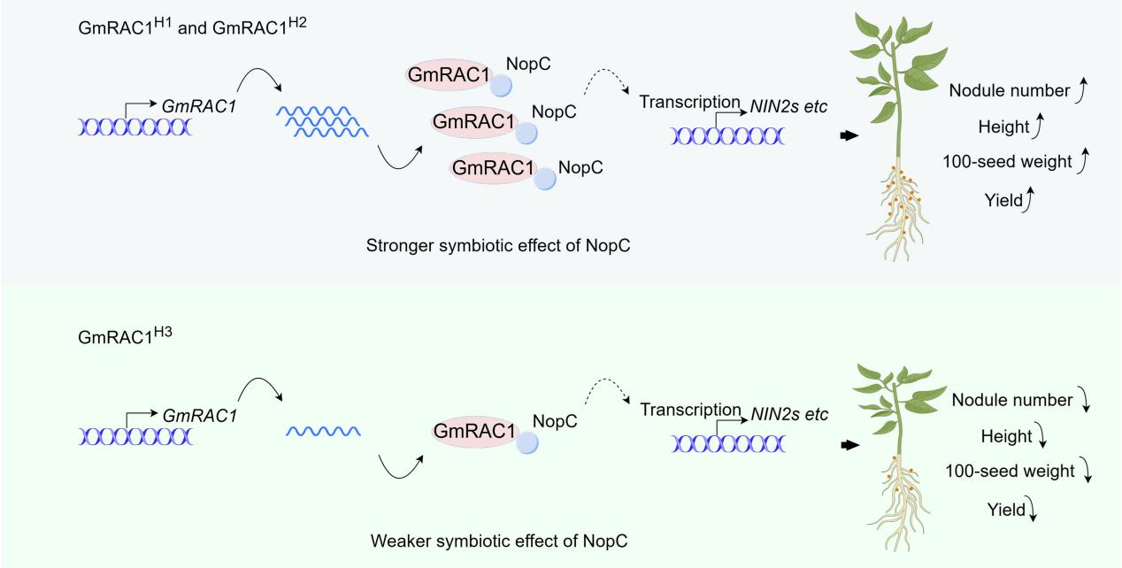 研究团队以广宿主型大豆根瘤菌Sinorhizobium fredii HH103为研究对象,聚焦其III型分泌系统效应蛋白NopC的共生功能。研究发现,NopC通过与大豆ROP/RAC家族GTP酶GmRAC1直接互作,激活关键共生基因GmNIN2a/2b与GmENOD40的表达,从而促进根瘤菌侵染、侵染线延伸与根瘤原基形成。进一步研究发现,GmRAC1启动子区域的自然变异显著影响其表达水平及与NopC协同促进共生的效率,其中高表达单倍型在育种过程中已被人工选择保留。尤为重要的是,该研究从“基础机制—自然变异—育种应用”全链条阐释了GmRAC1的生物学价值与育种潜力:过量表达GmRAC1或利用其优良单倍型,不仅能显著提高结瘤效率,还可协同增加植株株高、百粒重及单产,展现出一因多效的农艺性状调控功能。这为通过分子设计育种定向提升大豆共生固氮能力、减少氮肥依赖、实现绿色增产提供了新思路与新工具。