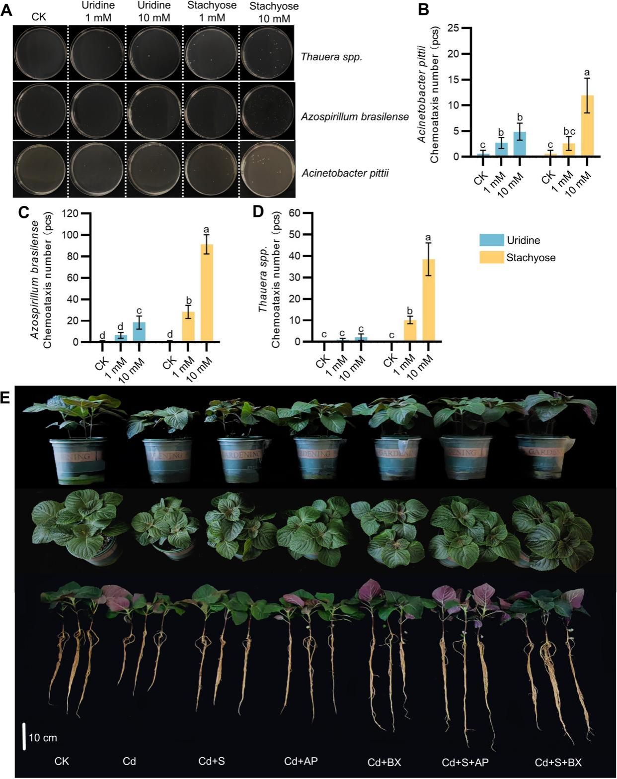 本研究通过多组学分析发现,碳水化合物作为调控植物‒微生物互作的关键介质,在根际微生物群落招募中发挥核心作用。与单一镉处理相比,接种 O. picturae 显著提高了紫苏组织内尿苷和水苏糖含量,而根系分泌物中仅水苏糖显著上升。为解析这一调控机制,通过趋化实验发现Azospirillum brasilense、Acinetobacter pittii和Thauera spp.在10 mM水苏糖条件下呈现显著的趋化响应,且具有剂量依赖性,而对尿苷的趋化作用微弱。盆栽验证进一步证实,A. brasilense、A. pittii和Thauera spp.均能缓解镉胁迫对植物的影响。其中,A. brasilense效果最为突出,可促进根系致密生长,并显著逆转镉胁迫引起的损伤,使根长、株高、茎粗、干重和鲜重恢复至对照水平。A. pittii与Thauera spp.的缓解效果相对较弱,修复能力有限,但A. pittii能使紫苏根系更发达。基于以上结果,研究选取水苏糖与效果较好的A. brasilense和A. pittii联合施用。结果表明,水苏糖的添加显著增强了微生物活性,并进一步提升了紫苏的镉耐受性。