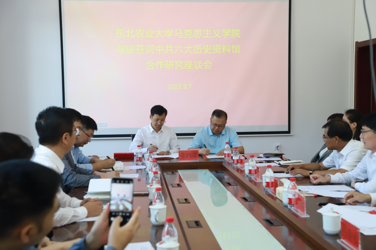 会上,贺景平和王镭共同为东北农业大学马克思主义学院实践教学基地揭牌。吕晶与中共六大历史资料馆负责人闫春光签订合作协议。贺景平为中共六大历史资料馆王玉富、闫春光两位同志颁发东北农业大学马克思主义学院客座教授聘书。