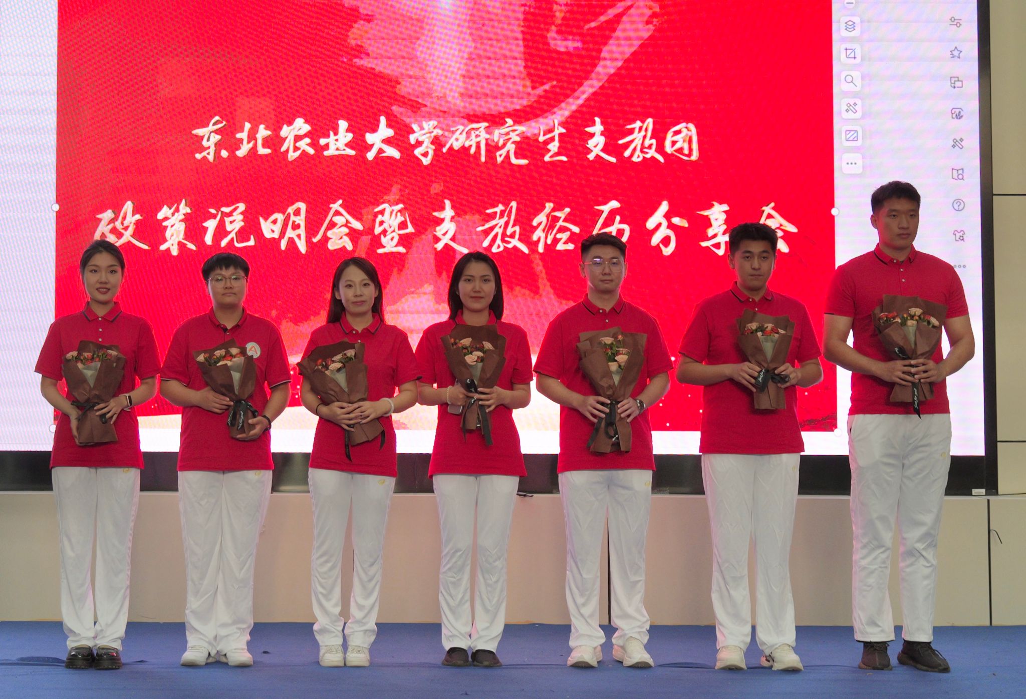 在校生志愿者代表为圆满完成支教任务的我校第九届研究生支教团成员献花,感谢他们在为西部地区和我省边境地区基础教育事业作出贡献时展现出的东农学子风采。
