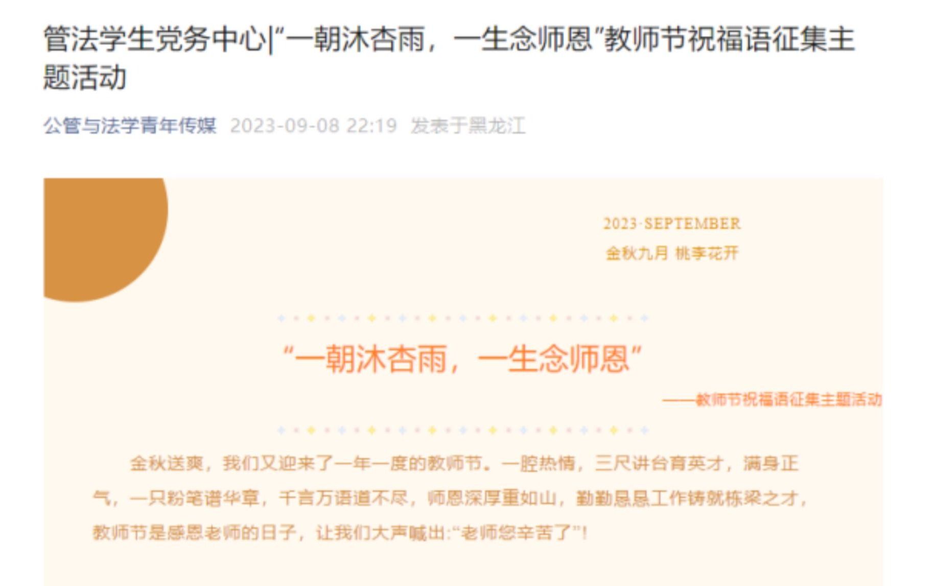 为表达对老师的感恩之情,学院特举办“桃李芬芳满园,赤诚担心一片”朗诵活动与“一朝沐杏雨,一生念师恩”征文活动。管法学子通过自己的方式向老师深情告白,用语言表达对老师的赞美与感恩之情,用文字为老师送上诚挚的节日祝福。