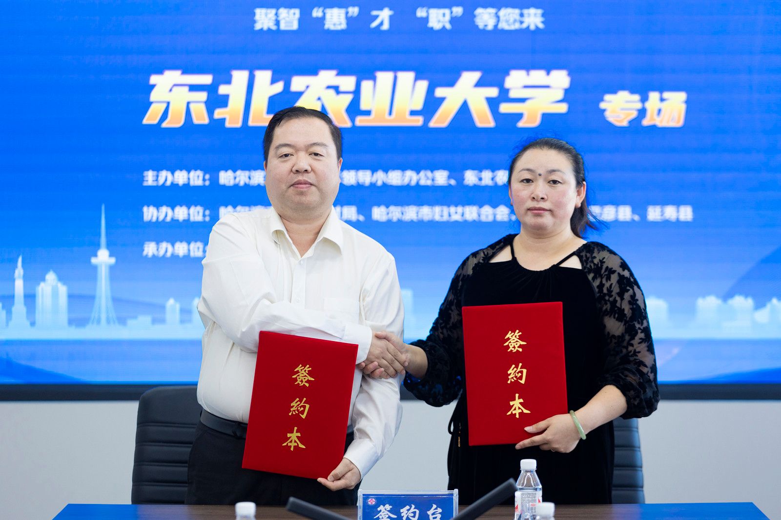 招聘会期间,召开了哈尔滨“丁香人才周”(秋季)活动暨市校合作东北农业大学专场活动校地合作对接会,我校党委副书记贺景平,组织部部长于雷,社会合作与成果转化中心(新农村发展研究院)主任(院长)朱志猛,教务处副处长马海鹍,科学技术处副处长贾树英、招生就业处副处长吴立龙出席会议。校市双方就联合办公机制运作、学生就业实习、科研成果转化、科技合作等方面进行了交流。延寿县信合有机稻米专业合作社经理罗翠华与东北农业大学经济管理学院工商管理系副教授杨辉,就共建东北农业大学经济管理学院校外农业硕士(农业管理方向)实习实训基地进行签约。