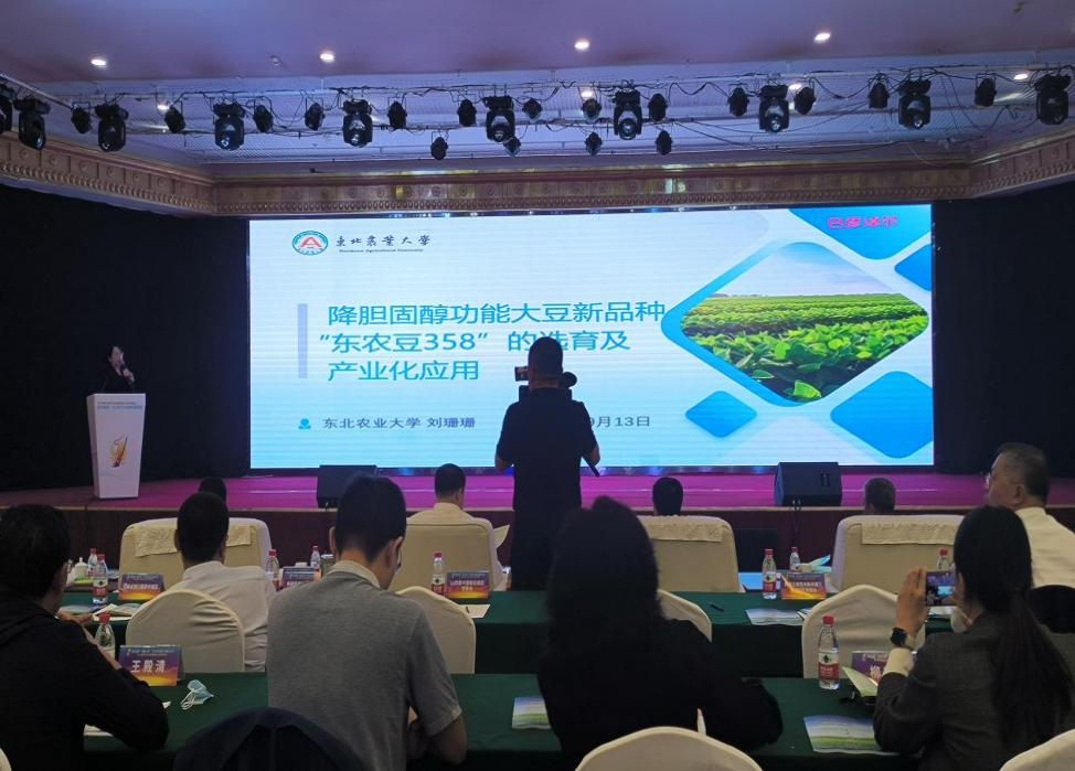 9月13日,巴彦淖尔市围绕国家农高区对农业科技创新成果的迫切需求,举办了“科技成果‘进园入县’巴彦淖尔国家农高区专场活动”,活动中共有来自全国各地高校、科研院所的11位专家学者进行了成果推介。刘珊珊教授携“降胆固醇特殊健康用途大豆新品种东农豆358”成果进行了现场推介,受到与会嘉宾及专家学者一致好评。“东农豆358”大豆新品种属世界首创,以该品种为原料生产的大豆蛋白粉(DND358-SPI)具有与非诺贝特同等的降胆固醇疗效,得到国内外功能食品营养界同行的广泛关注,具有重大推广价值。