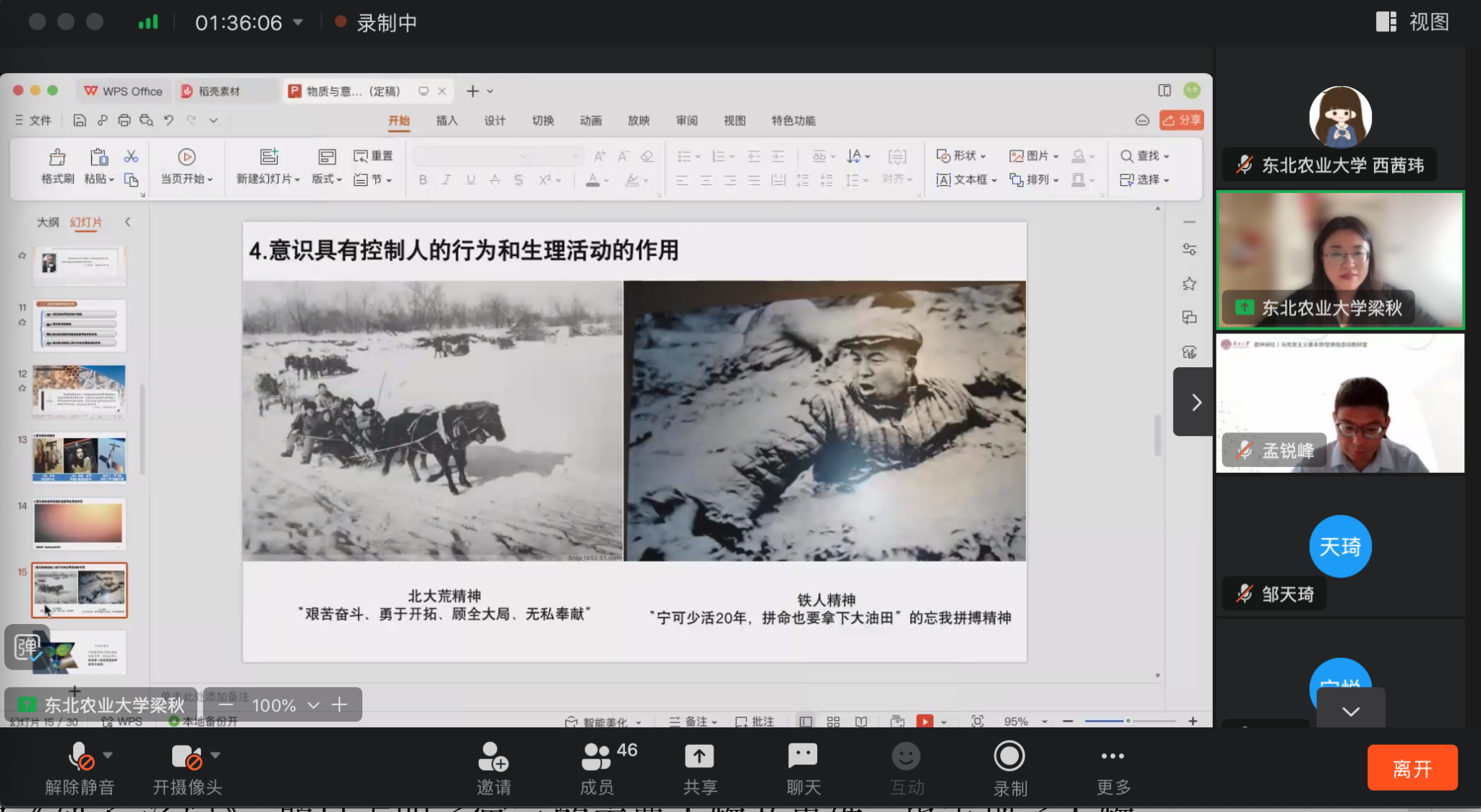 会上,我校马克思主义学院教师梁秋以说课的方式分享了“物质与意识的辩证关系”这一教学要点,围绕物质决定意识、意识对物质具有反作用、主观能动性和客观规律性的辩证统一、意识与人工智能四部分,通过引证经典著作增强课堂理论教学的说服力。她表示,要深度挖掘立足龙江特有的红色文化精神和东农精神来佐证原理,增强学生对于原理的深入理解和掌握。