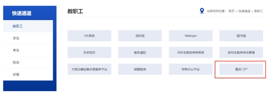 1. 通过学校官网入口访问:点击学校官网主页右上方“融合门户” ,左上方“教职工”“学生”,页面底部“融合门户”,均可进入融合门户系统。
