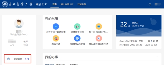 登录融合门户后,在页面左侧可以查看本人neau.edu.cn域名邮箱未读邮件数,点击“我的邮件”可直接跳转查看邮件,不用再次登录。