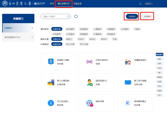 “网上办事大厅”,为师生提供统一的校园办事服务入口,力求实现校内在线办事服务的优化整合,为教职工、学生、校友和社会访客等多维度人群提供智能化、多元化、便捷化的一网受理中心,真正实现一个入口、一网通办。