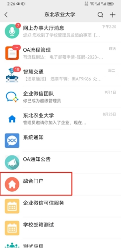 (2)通过学校企业微信内“融合门户”应用入口访问。