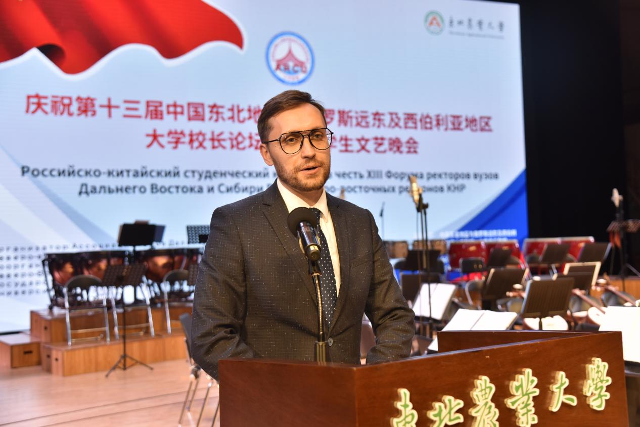 中俄大学联盟中方主席、东北农业大学校长付强和中俄大学联盟俄方主席、太平洋国立大学校长马尔芬•尤里•谢尔盖耶维奇在文艺演出中致辞。付强表示,200余名中俄高校领导和代表齐聚哈尔滨,共襄校长论坛,共谋合作大计,共话中俄友谊,相信在中俄两国元首的战略引领下,在中俄两国教育主管部门的大力支持下,中国东北地区与俄罗斯远东及西伯利亚地区大学联盟的工作必将蓬勃发展、再创辉煌。各校联手为各位嘉宾和同学们献上一场视听盛宴,以此庆祝中俄高等教育合作的累累硕果,展现中俄大学联盟十一年来的显著成就,传承中俄青年历久弥新的深厚友谊,续写新时代中俄友好交往新篇章。