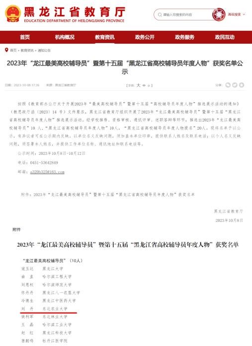 近日,由省委教育工委、省教育厅会同省委宣传部、省教科文卫体工会共同组织开展的2023年“龙江最美高校辅导员”暨第十五届“黑龙江省高校辅导员年度人物”推选展示活动圆满落下帷幕,共推选出2023年“龙江最美高校辅导员”10人,“黑龙江省高校辅导员年度人物”10人,“黑龙江省高校辅导员年度人物提名”20人。经资格审核、通讯评审、述职答辩等环节的激烈角逐,我校农学院辅导员刘丹荣获得2023年“龙江最美高校辅导员”荣誉称号,并推荐参加全国评选。