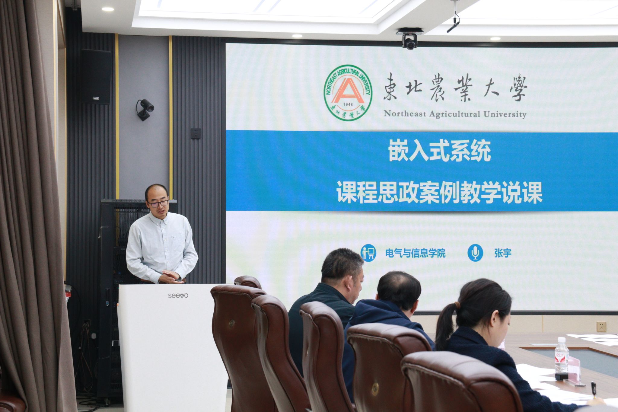 经过初赛选拔,共有16名教师进入决赛,决赛环节由副院长李晓明主持,经济管理学院教授王杜春、马克思主义学院教授许静波、工程学院教授刘建禹担任决赛评委,电气与信息学院各系部主任、副主任、党支部书记及青年教师出席并观摩比赛。