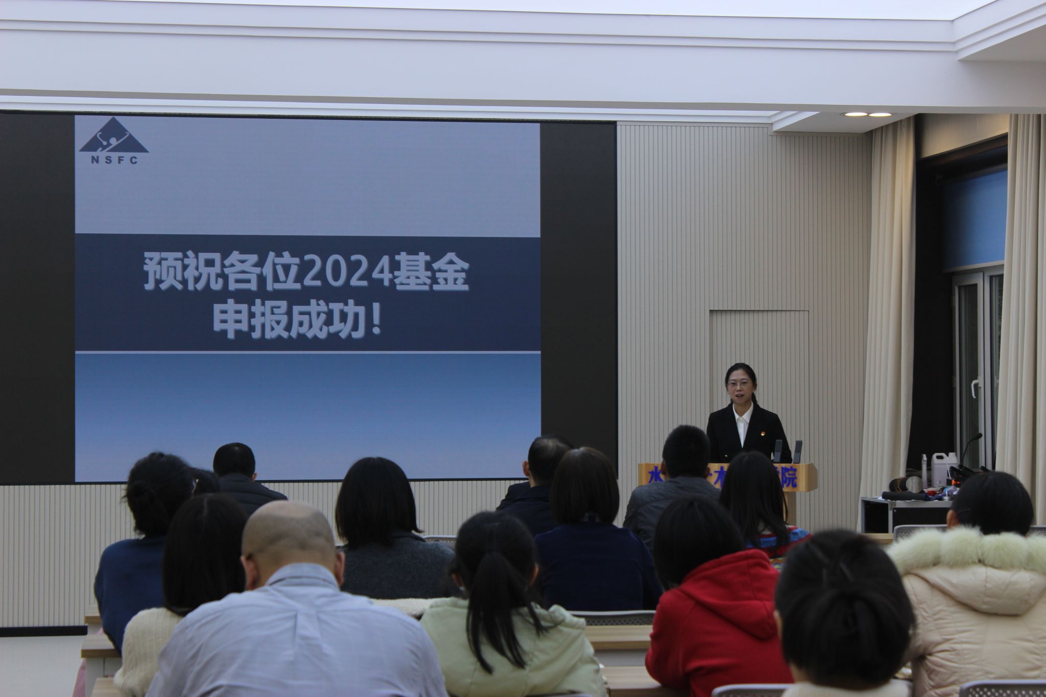 王子龙对学院近年来国家自然科学基金的申报工作、取得的成绩和存在的问题进行了分析和解读,对学院2023年度获得国家自然科学基金资助的老师表示祝贺,对学院2024年度申报工作做了安排。学院农业水利工程系系主任李天霄从基金申请前准备、申请书撰写要点、基金评审等角度,作了题为《国家自然科学基金申请经验交流》的专题分享报告。