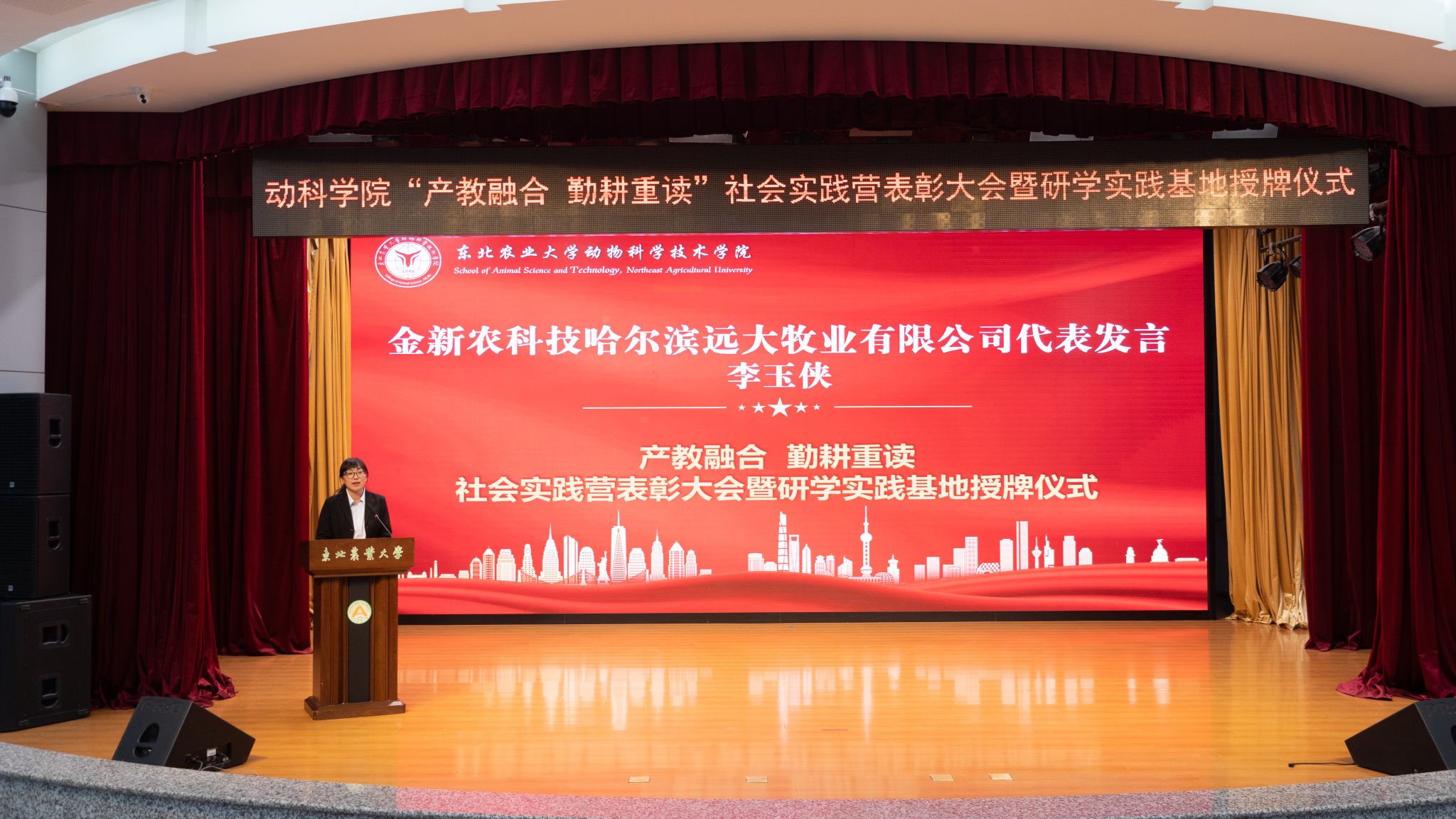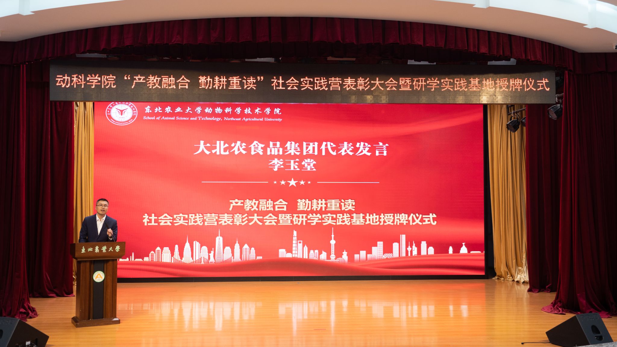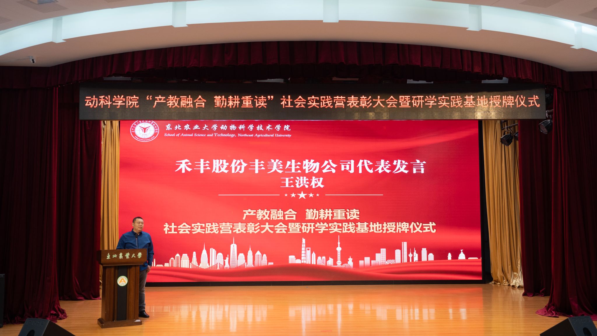 11月15日下午,动物科学技术学院举办“产教融合 勤耕重读”社会实践营表彰大会暨研学实践基地授牌仪式。来自北京小龙潜行科技有限公司、禾丰股份沈阳丰美生物技术有限公司、金新农科技哈尔滨远大牧业有限公司、大北农食品集团等15家行业知名企业的18位企业高管齐聚东农,与学院共商耕读教育新载体,研讨科研服务畜牧业振兴发展新途径。学院领导班子,2022级、2023级全体学生参加此次活动,大会由学院党委副书记焦阳主持。