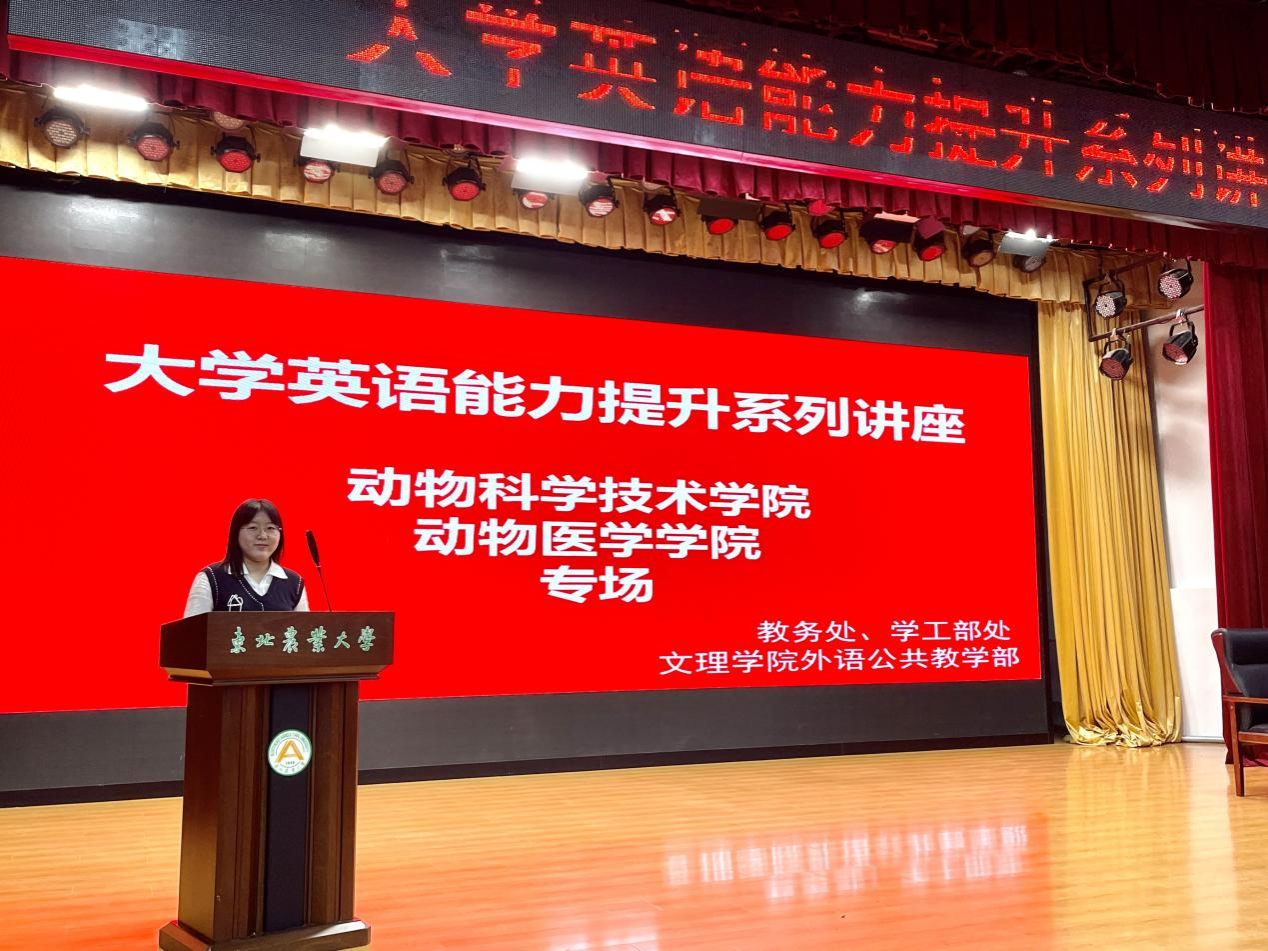 为进一步提升学生英语学习能力及文化素养,近日东北农业大学举办了大学英语能力提升系列讲座。此次讲座由教务处、学工部和文理学院外语公共教学部联合举办,分设食品学院专场、动科动医学院专场,及英语考研专场。