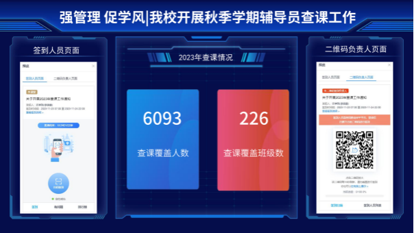 数字管理,高效查课。为提高查课效率,减少对教学进度影响,采用今日校园APP动态扫码签到方式开展查课工作,对全校226个班级课堂出勤情况进行核查,覆盖6093名本科生。