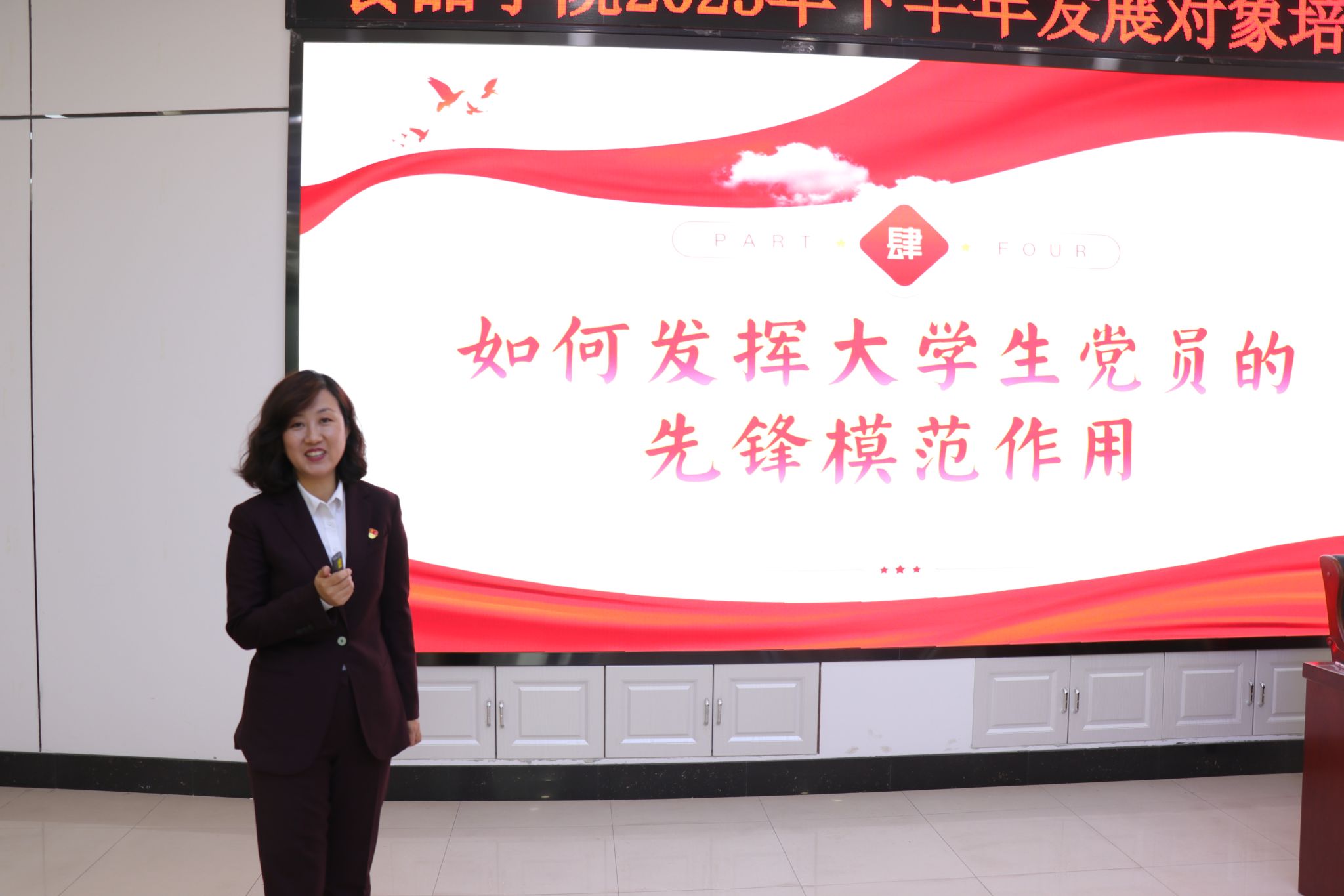 侯坤以《担民族复兴历史使命 做德法兼修时代新人》为题,号召广大党员发展对象要牢固树立“建设中国特色社会主义法治体系、建设社会主义法治国家”的远大理想,培养内心的法治信仰,德法兼修、脚踏实地、勇往直前、拼搏进取。何鎏以《以大历史观探究马克思主义中国化时代化的历史溯源》为题,强调学习马克思主义中国化时代化更应该看到其提出的背景后所蕴含的哲学思想,应加强广大党员发展对象的党性修养,牢记初心,为实现中华民族伟大复兴注入磅礴力量。钱芳以《大学生党员要做有理想有本领有担当的青年先锋》为题,从端正入党动机、如何成为一名合格的共产党员等三方面内容展开,为党员发展对象应该在哪些方面发挥先进性和模范带头作用提出了具体建议。崔丽以《以信仰之光照亮前行之路》为题,分享了在省委党校专题培训班的学习体会,并从如何理解信仰、在理论学习中筑牢信仰之基、青年要做有信仰的奋斗者三方面引导激励同学们坚定如磐信念,锤炼过硬本领,不负韶华,奋斗向前。金靖博以《继承和弘扬中国共产党人精神谱系》为题,讲授面对当今风雨变幻的世界局势,当代青年必须跟紧时代潮流,不断积极进取,发扬中国革命精神的优良传统,为祖国未来做出更大贡献。赵旭明以《严格执行<黑龙江省普通高等学校发展党员工作规程(试行)>,切实提高发展党员工作质量》为题,强调发展党员工作是一项事关党的事业兴衰成败的大事,是关系到党的战斗力和生命力的重大问题,要从战略和全局的高度,充分认识到做好新形势下高校发展党员工作的重大意义。