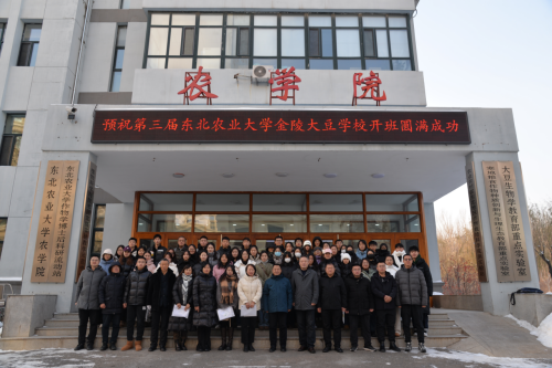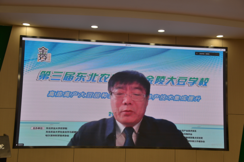 2023年11月26日上午,以“高油高产大豆品种选育、大豆单产技术集成提升”为主题的第三届金陵大豆学校开班式在东北农业大学农学院举行。东北农业大学副校长孙占峰,黑龙江省农业农村厅科教处处长樊丽娜、国家大豆产业技术首席科学家吴存祥研究员、哈尔滨市科学技术协会科普处处长马叶林、农学院党委书记李晓书、院长陈庆山、新农村研究院副院长李麒麟、农学院副院长张林、教师代表及全体线下学员参加本届开班式。开班式由东北农业大学新农村发展研究院院长朱志猛主持。