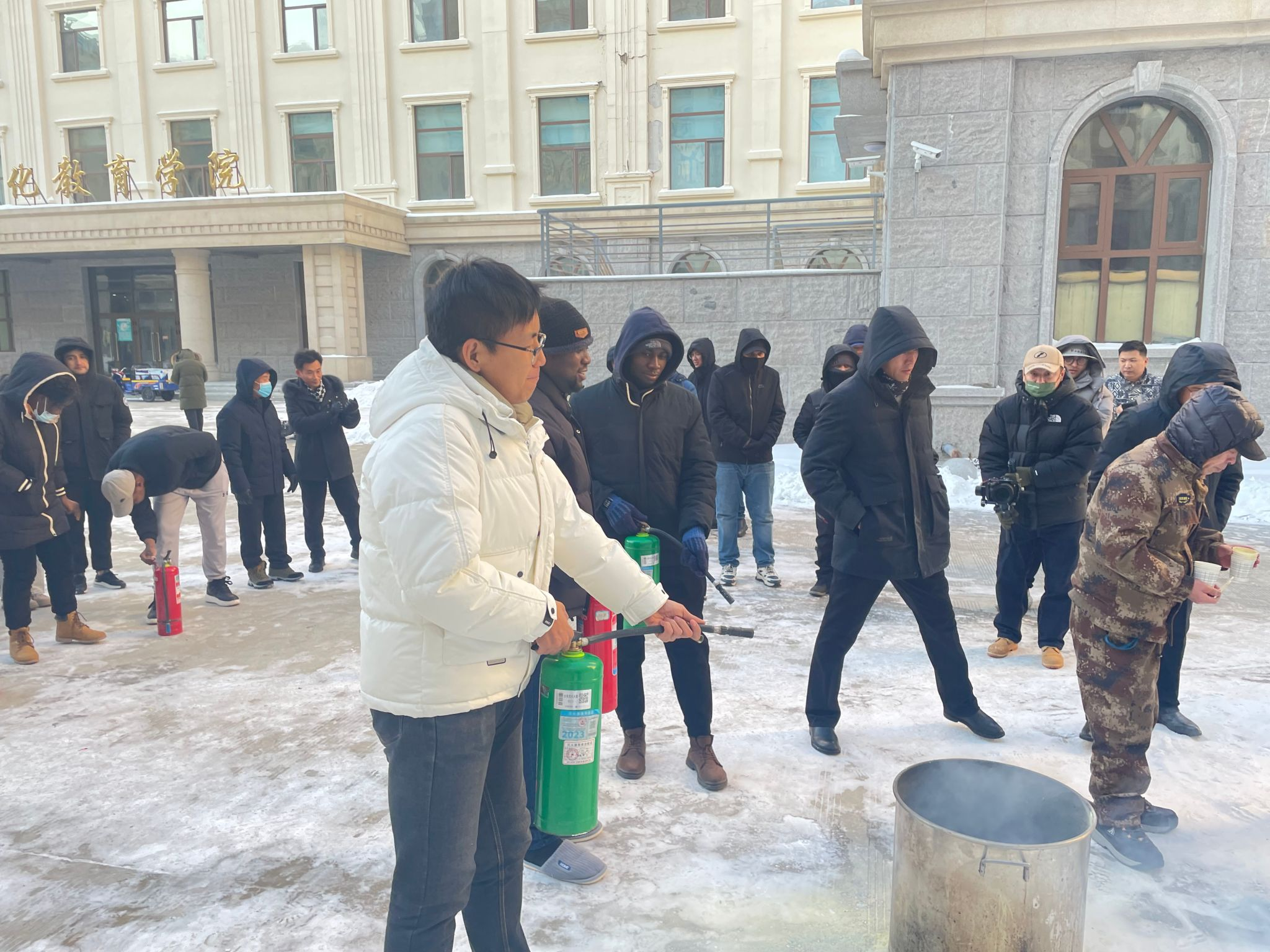 讲座结束后留学生同学们在老师的指导下,按照应急预案进行了疏散演练,随着警报声响起,同学们有序地从公寓楼内向楼外疏散。随后,保卫处工作人员为同学们讲解灭火器及灭火毯的正确使用方法以及使用过程中的注意事项并进行了实际演练。