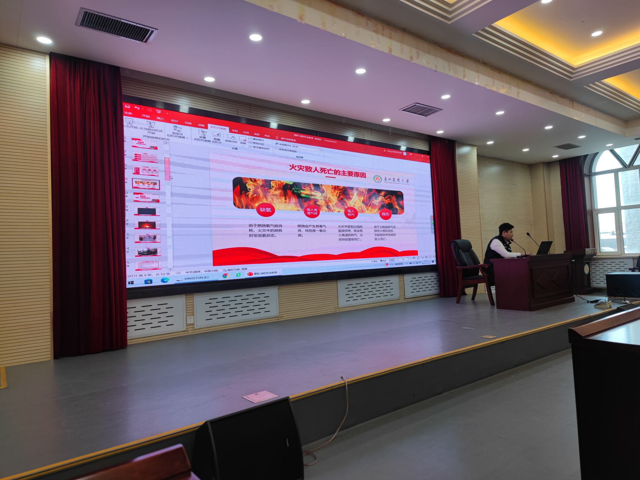 保卫处刘浩东为大家讲解了日常电器的安全使用规范,安全用电的注意事项,以及火灾逃生常识等消防安全知识,并通过列举生活中真实发生的案例向同学们展示了火灾造成的严重危害。