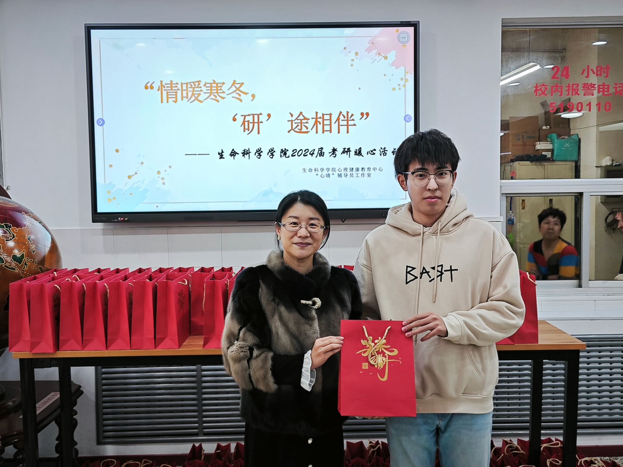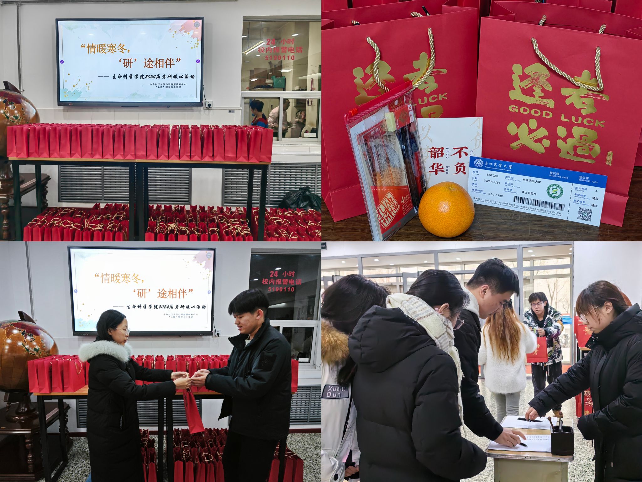冬日有暖阳,“研”途有温情。为帮助2024届考研学子坚定备考信心,鼓舞士气,传递关爱与力量,近日,生命科学学院组织开展“情暖寒冬‘研’途相伴”考研暖心助力活动。学院党委书记施喜军,副书记孙珠红,2024届本科毕业班辅导员韩宗伯、心理健康教育中心指导教师赵彩桐参加活动并为考研学子发放“考研暖心礼包”。学院领导和老师们与考研学子亲切交流并送上美好的祝福,激励同学们在考前最后冲刺阶段,调整好心态,提高学习效率,树立信心,劳逸结合,坚持到底,争取成功“上岸”。