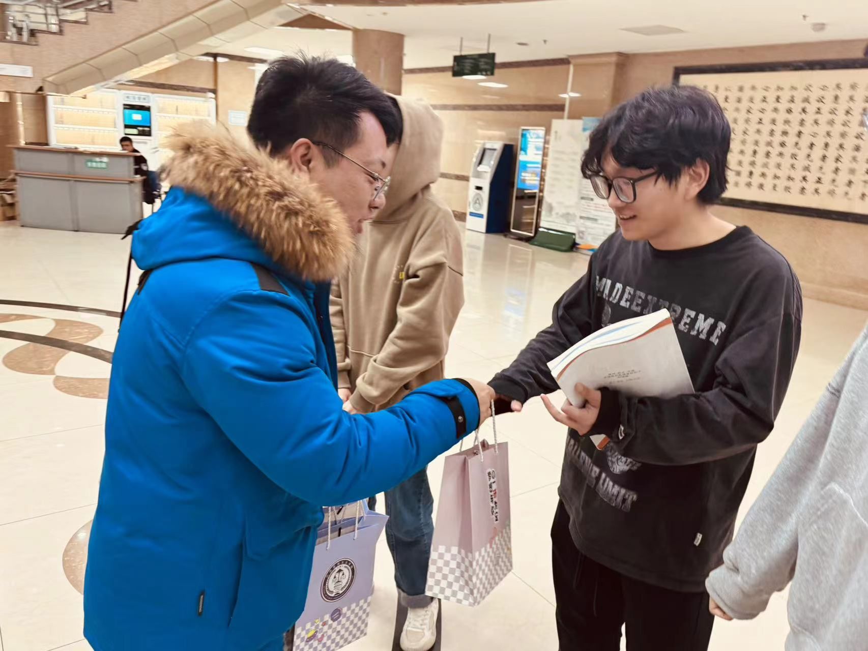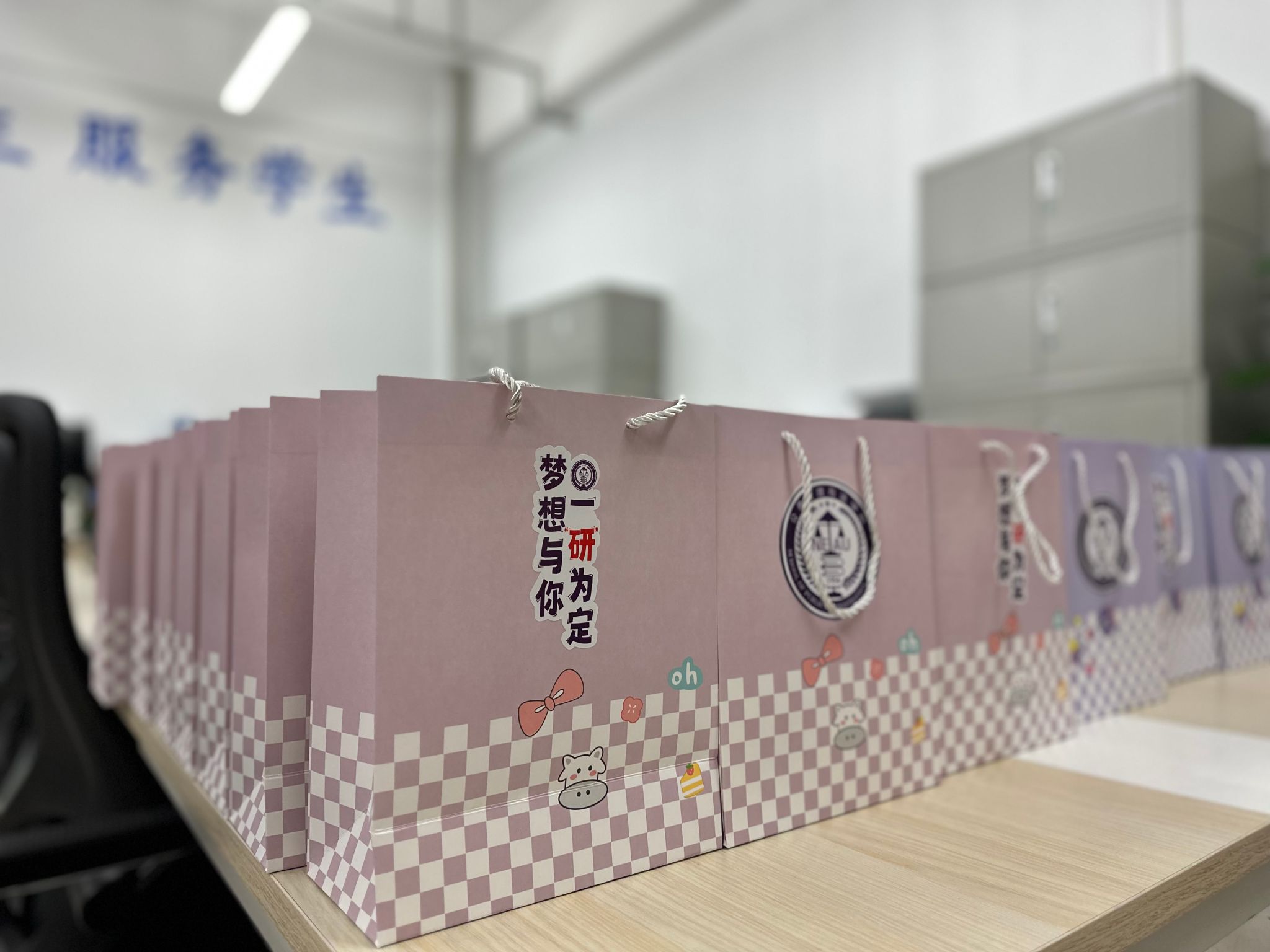 杜国明为考研学生代表发放考研暖心福袋,让考研学子感受到来自学院的温暖和力量。考研暖心福袋中包含寓意“妙笔生花”的文具套装、“心想事成”的新鲜橙子、“非你不可”的咖啡以及“榜上有名”的棒棒糖,饱含了学院对同学们的美好期望和殷切祝福。